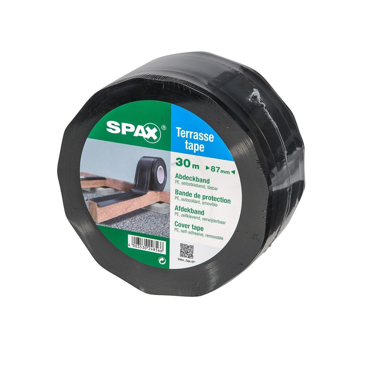 SPAX Bande d‘étanchéité Le ruban adhésif protège la structure en bois contre les eaux de pluie. Ruban en polyéthylène basse densité, autocollant, détachable sans laisser de résidus Epaisseur : 0,5 mm Dimensions : L x B x H = 30 m x 87 mm x 0,5 mm