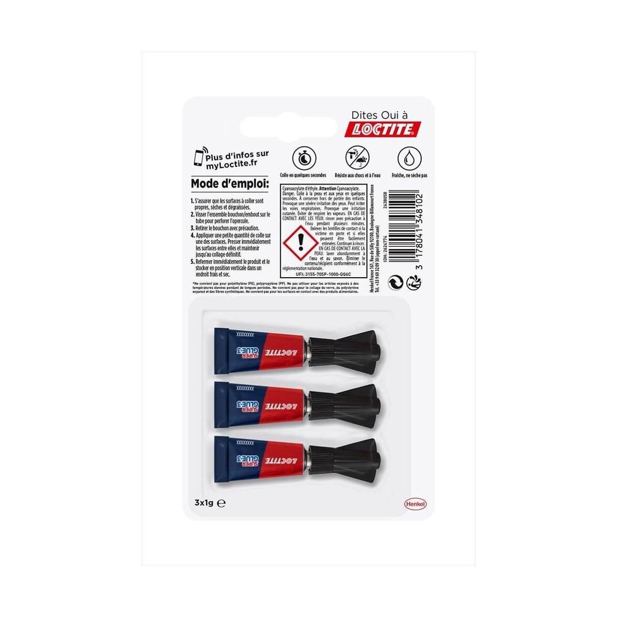 Résiste à l’eau Loctite Super Glue-3 MINI DOSES Liquide base cyanoacrylate est une colle instantanée super puissante, pour coller en quelques secondes la majorité des matériaux. Sa formule ultra puissante peut coller jusqu’à 270kg au cm2. Le format 3x1g Mini Trio est idéal pour les utilisations uniques. Cette formule résiste à l’eau et maintenant au lave-vaisselle. Nom du produit: Colle glue liquide Usage du produit: Réparer Type de support: Tout type de support Intérieur / extérieur: Intérieur / extérieur Marque du produit: LOCTITE Conditionnement: Blister Contenance: 3 X 1GR Consistance / aspect: Liquide Sans solvant: Oui Composition: Cyanoacrylate Astuce: Appliquer un peu de colle sur une seule des deux surfaces Assembler et presser pendant 10 secondes ou plus suivant le matériau : c’est collé Temps de prise (en s, min ou h): 10S Temps de séchage complet (en min ou h): 1MN Peut être peint: Non Résiste au gel: Oui Résiste aux vibrations: Non Résiste aux torsions: Non Résiste à l'humidité: Oui Repositionnable: Non Mentions légales: Dangereux. Respectez les précautions d’emploi. Utilisez les produits biocides avec précaution. Avant toute utilisation, lisez l’étiquette et les informations concernant le produit. Produit emballé : hauteur (en cm): 16.5 Produit emballé : largeur (en cm): 9.8 Produit emballé : profondeur (en cm): 1.1 Produit emballé : poids (en kg): 0.024 Indication du geste de tri (triman): Nos produits et emballages peuvent faire l'objet d'une consigne de tri. Pour en savoir plus : www.quefairedemesdechets.fr