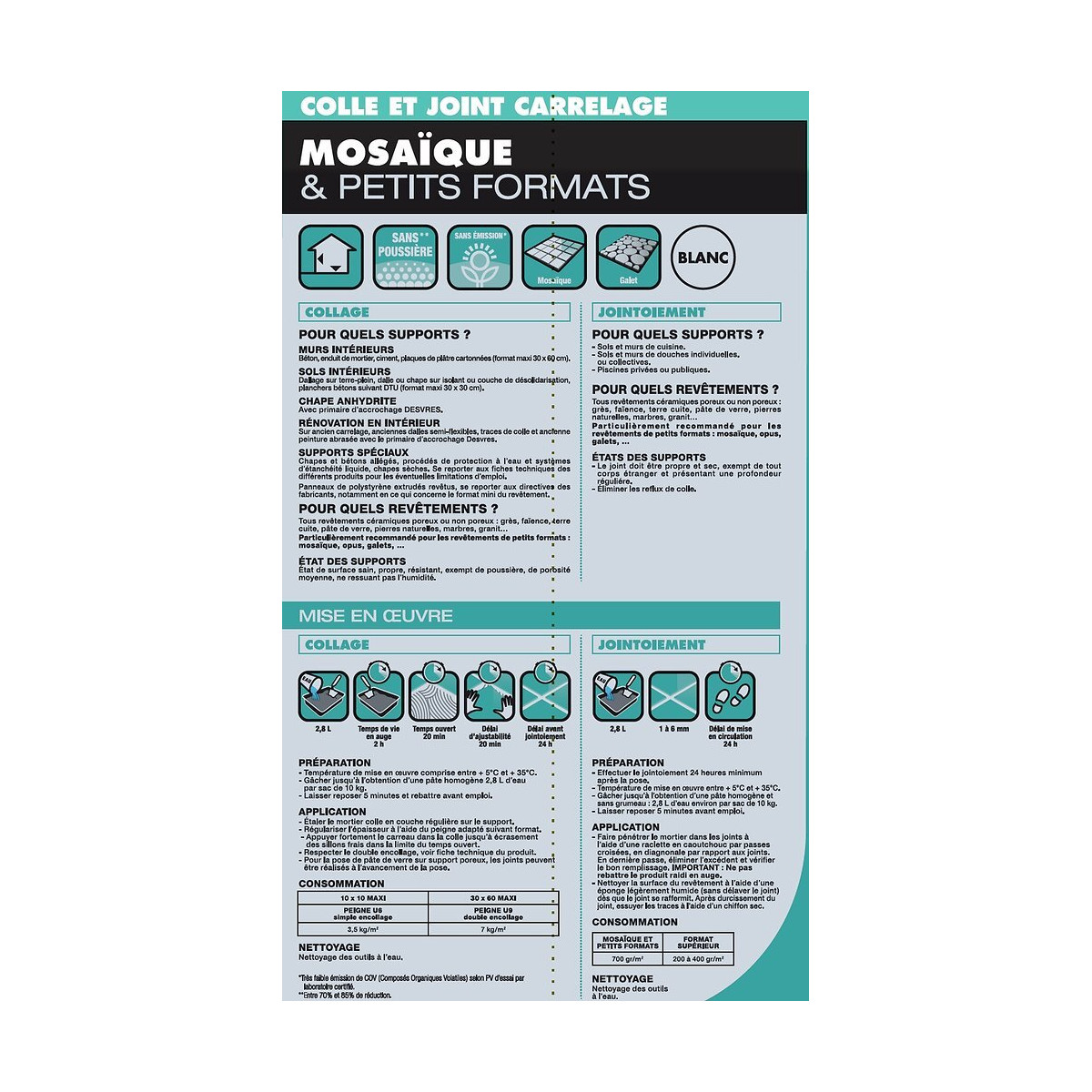 Finition soignée Colle et joint 2en1 en poudre, blanc, pour mosaïques et petits formats Usage du produit: Coller et / ou jointoyer Destination: Mur Couleur: Blanc Colle compatible espaces humides: Oui Colle compatible piscine: Oui Colle compatible tout type de sol chauffant: Non Taille maximale des carreaux (en cm): 30 x 30 Rendement (en m² ou ml couverts): 2 Type de support adapté: Support neuf et ancien Type de revêtement à poser: Mosaïque Largeur du joint (largeur minimum à largeur maximum) (en mm): De 1 à 6 Qualité de l'air intérieur: A+ Mentions légales: Dangereux. Respecter les précautions d'emploi Indication du geste de tri (triman): Nos produits et emballages peuvent faire l'objet d'une consigne de tri. Pour en savoir plus : www.quefairedemesdechets.fr