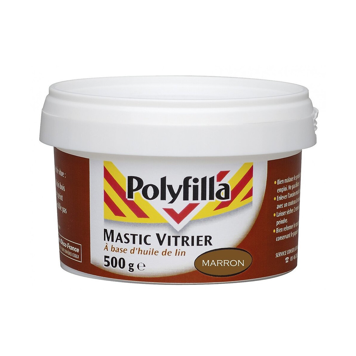 Ce mastic peut être peint et ne se fendille pas. Destination du produit: Vitre Usage du produit: Vitrier Support: Bois, métal, aluminium, béton Composition: Polymère Type de produit: D'étanchéité Aspect: Mat Garantie de résistance (en année): 3 ans sur l'étanchéité, l'adhérence et la blancheur du joint Temps de séchage (en h): 1 Type de packaging: Pot Couleur: Marron Marque du produit: POLYFILLA Pistolet nécessaire: Oui Peut se peindre: Oui Qualité de l'air intérieur: C Produit emballé : hauteur (en cm): 6.1 Produit emballé : largeur (en cm): 9.5 Produit emballé : profondeur (en cm): 9.5 Produit emballé : poids (en kg): 0.524 Indication du geste de tri (triman): Nos produits et emballages peuvent faire l'objet d'une consigne de tri. Pour en savoir plus : www.quefairedemesdechets.fr Mentions légales: Dangereux. Respecter les précautions d'emploi