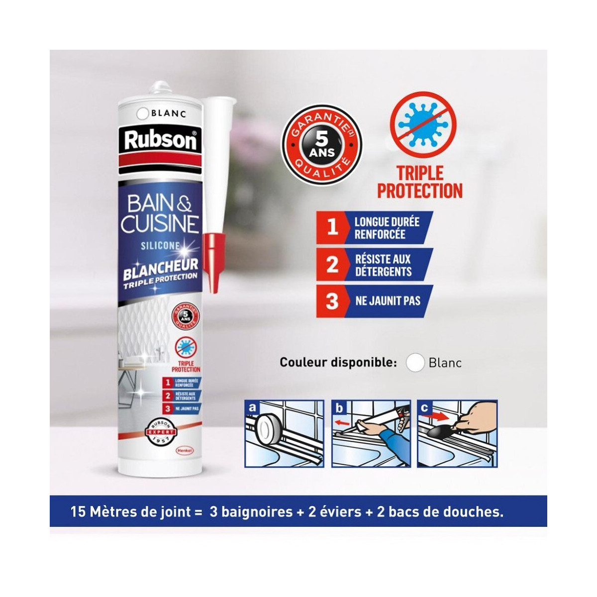 Mastic silicone triple action anti moisissures, adhérence matériaux synthétique, blancheur longue durée. Destination du produit: Cuisine Usage du produit: Joint d'étanchéité silicone grande blancheur et grande durée Support: céramique, émail, matériaux composites Composition: Silicone acétique Type de produit: D'étanchéité Aspect: Brillant Temps de séchage (en h): 24 Type de packaging: Cartouche Couleur: Blanc Marque du produit: RUBSON Pistolet nécessaire: Oui Peut se peindre: Non Conseil d'utilisation: à utiliser sur support propre et sec Qualité de l'air intérieur: A Produit emballé : hauteur (en cm): 23 Produit emballé : largeur (en cm): 5 Produit emballé : profondeur (en cm): 5 Produit emballé : poids (en kg): 0.35 Indication du geste de tri (triman): Nos produits et emballages peuvent faire l'objet d'une consigne de tri. Pour en savoir plus : www.quefairedemesdechets.fr Mentions légales: Dangereux. Respecter les précautions d'emploi