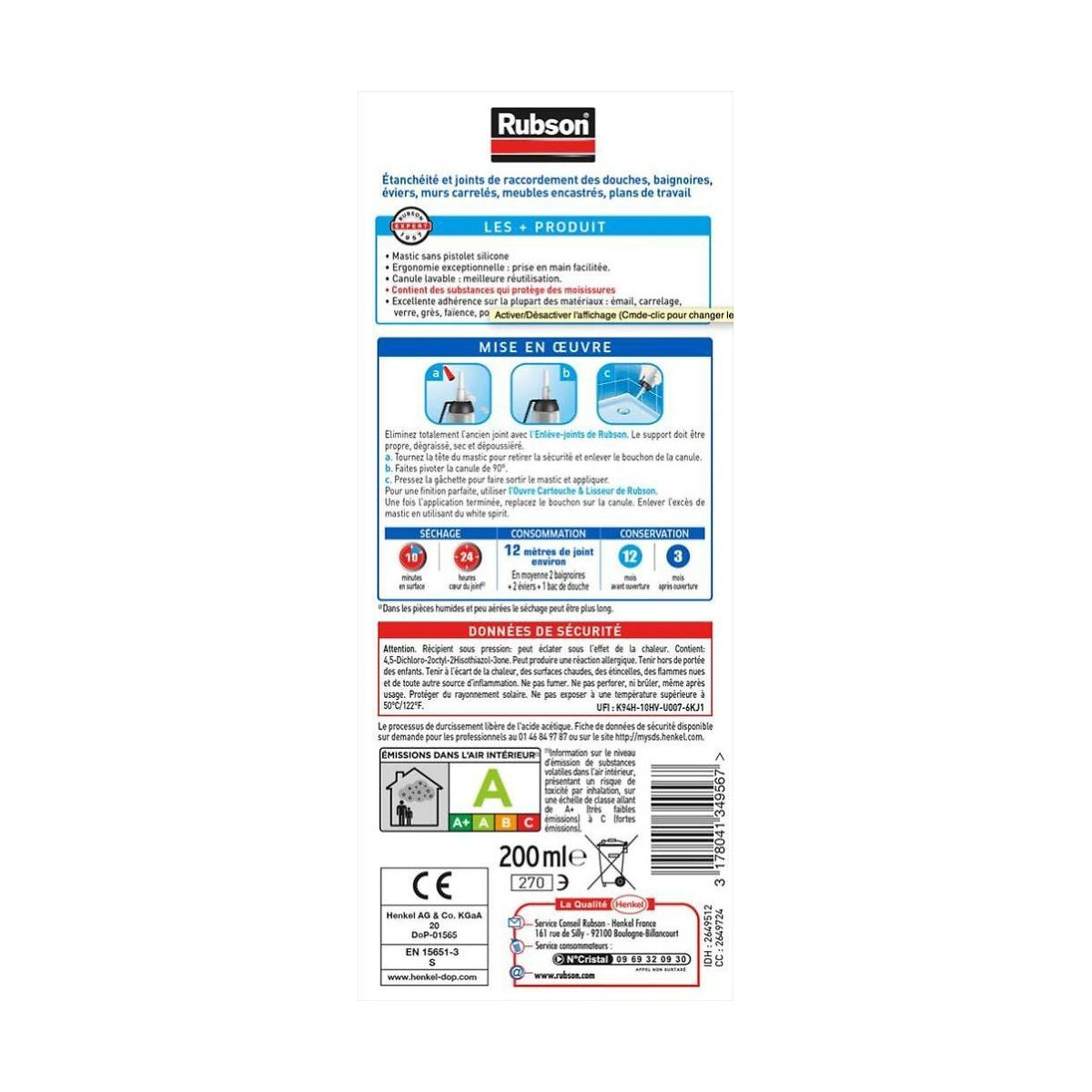 Prêt l'emploi (Usage sans pistolet) Extrusion facile à base d'air comprimé Agents anti-moisissures : ne noircit pas. Elasticité supérieure longue durée. Reste souple et étanche. Prêt l'emploi (Usage sans pistolet) Extrusion facile à base d'air comprimé Agents anti-moisissures : ne noircit pas. Elasticité supérieure longue durée. Reste souple et étanche. Destination du produit: Cuisine Usage du produit: Cuisine et bain Support: Emails, matériaux synthétiques, douches, baignoires,éviers, lavabos… Composition: Silicone Type de produit: D'étanchéité Aspect: Brillant Garantie de résistance (en année): 5 ans sur l'étanchéité, l'adhérence et la blancheur du joint Temps de séchage (en h): 24 Type de packaging: Aérosol Couleur: Transparent Marque du produit: RUBSON Pistolet nécessaire: Non Peut se peindre: Non Conseil d'utilisation: Faire un essai préalable sur les matériaux sensibles : marbre, miroir … Qualité de l'air intérieur: A Produit emballé : hauteur (en cm): 27.7 Produit emballé : largeur (en cm): 6.2 Produit emballé : profondeur (en cm): 4.5 Produit emballé : poids (en kg): 0.286 Indication du geste de tri (triman): Non Mentions légales: Dangereux. Respecter les précautions d'emploi