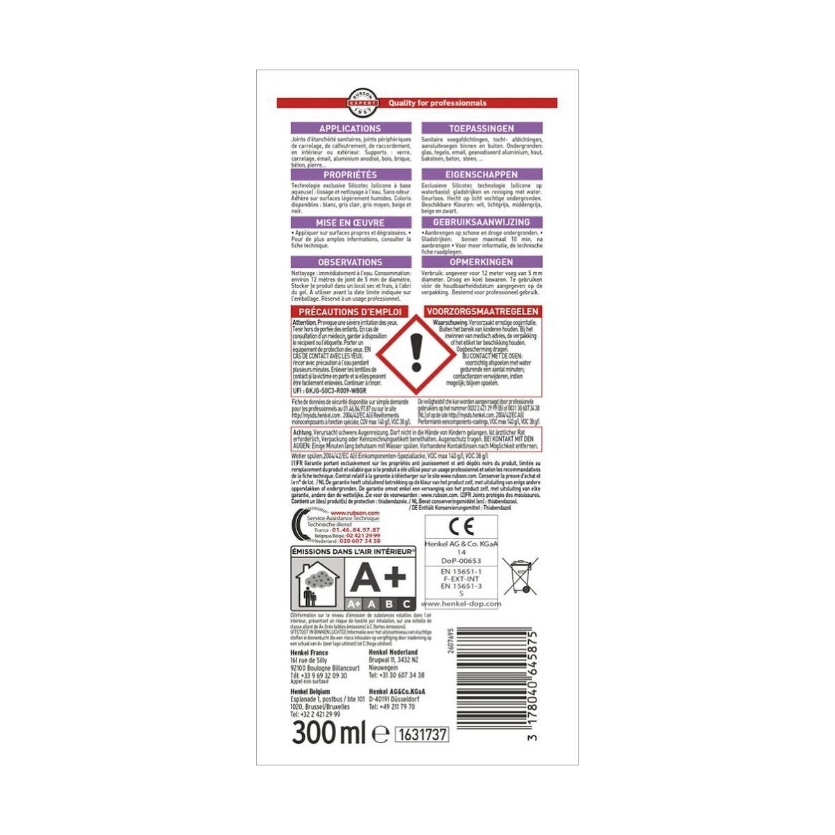 Silicone à l'eau pour raccordement et joint périphérique de carrelage. Pour tous supports carrelés et verre. Destination du produit: Cuisine Usage du produit: Pour l'étanchéité des élements de salle de bain & cuisine Support: céramiques, verre Composition: Silicone Type de produit: Pour raccordement Aspect: Mat Temps de séchage (en h): 24 Type de packaging: Cartouche Couleur: Blanc Marque du produit: RUBSON Pistolet nécessaire: Oui Peut se peindre: Non Conseil d'utilisation: utilisation sur support secs Qualité de l'air intérieur: A+ Produit emballé : hauteur (en cm): 23 Produit emballé : largeur (en cm): 5 Produit emballé : profondeur (en cm): 5 Produit emballé : poids (en kg): 0.449 Indication du geste de tri (triman): Nos produits et emballages peuvent faire l'objet d'une consigne de tri. Pour en savoir plus : www.quefairedemesdechets.fr Mentions légales: Dangereux. Respecter les précautions d'emploi