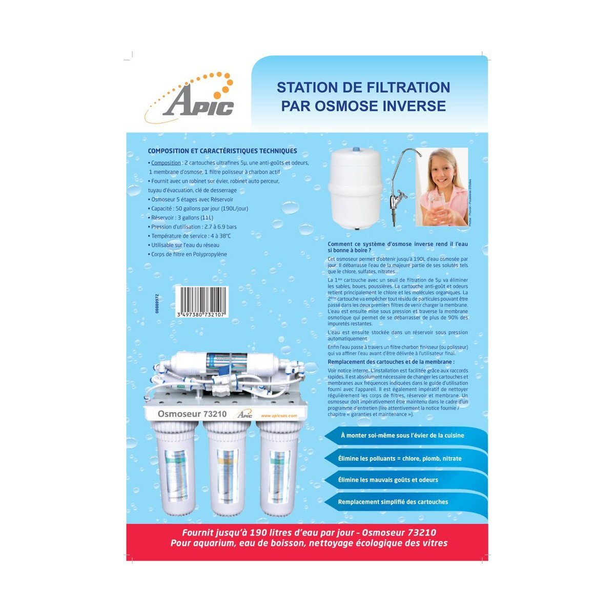 Osmoseur 5 étages avec réservoir. Réduit la concentration des solides dissous et améliore le goût et l'odeur de l'eau. Ce système d'osmose inverse permet d'obtenir jusqu'à 190L d'eau osmosée par jour. Débarrasse l'eau de la majeure partie de ses solutés tels que le chlore, sulfates, nitrate. Composition : deux cartouches ultrafines 5microns (la première va éliminer les sables, boues, poussières, la seconde va empêcher tout résidu de particules pouvant être passée dans les deux premiers filtres de venir charger la membrane), une cartouche anti goûts et odeurs (retient principalement le chlore et les molécules organiques), une membrane d'osmose, un filtre polisseur à charbon actif. Corps de filtre en polypropylène. Fourni avec un robinet sur évier, robinet auto perceur, tuyau d'évacuation, clé de desserrage. Utilisable sur l'eau du réseau