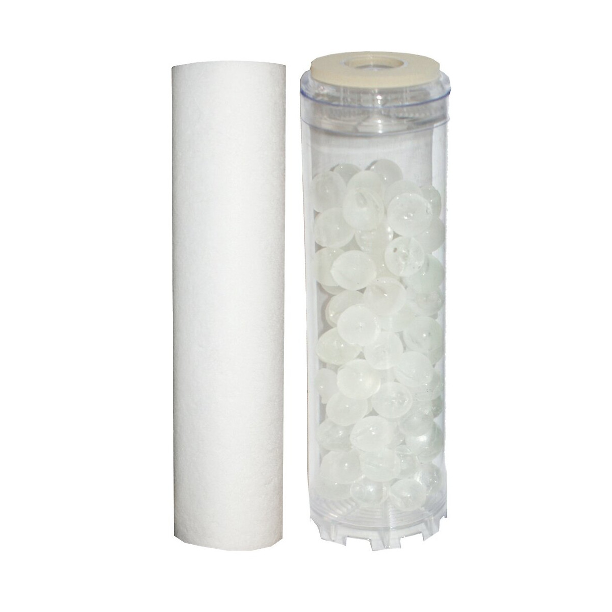 Lot de 2 cartouches avec une cartouche anti sédiments et une anti calcaire. La cartouche anticalcaire est remplie de cristaux de polyphosphate, elle maintient le calcaire en suspension dans l'eau, et empêche la formation de tartre sans dénaturer l'équilibre carbonique de l'eau. La cartouche ultrafine technologie Meltblown filtre les particules en suspension de taille supérieure à 5microns comme l'argile, la rouille, les particules de tartre, le sable... 100% alimentaire.