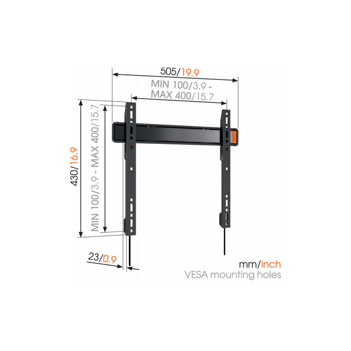 wall3205black - Le support TV mural fixe Vogel's WALL3205BLACK est particulièrement populaire. Le WALL3205BLACK est adapté à globalement chaque téléviseur de 32 à 55 pouces (81-140 cm), pour une fixation bien solide à plat contre le mur. Vous cherchez une façon solide et sûre de fixer votre téléviseur à plat contre le mur ? Le support mural fixe WALL est une solution fiable et simple, avec la qualité Vogel's garantie. Grâce au support TV mural fixe WALL, un téléviseur peut être facilement fixé à plat contre le mur. L'absence d'éléments mobiles ou saillants limite le risque de dommages. - Type de produit : Support mural. Type de support : Support fixe. Compatibilité : Ecrans plats. Poids maximum supporté (kg) : 50. Taille écran (cm) : De 82 à 140 cm. Taille Minimum de L'Ecran : 32. Taille Maximum de L'Ecran : 55. Gestion des câbles : Non. Norme VESA : 100 x 100 ou 400 x 400 mm. VESA max (en mm) : 400 x 400. Couleur : Noir. Distance minimum au mur : 23. Largeur (cm) : 50.5. Hauteur (cm) : 43.