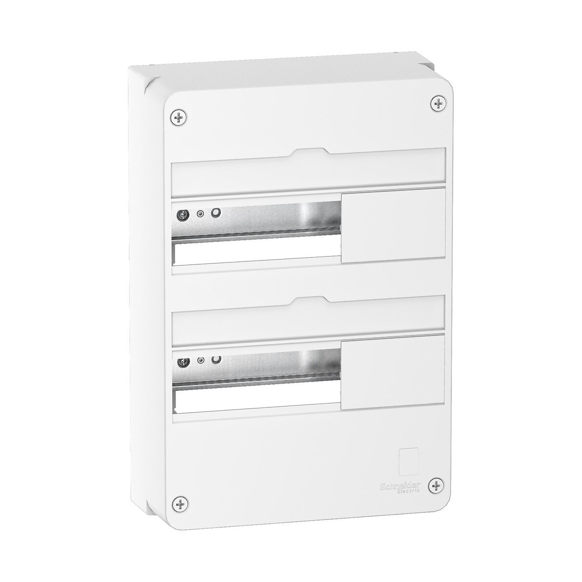 Coffret nu à équipe - 2 rangées de 13 modules Resi9 - IP30 - Pose en saillie - Bornier terre inclus - Possibilité d'équiper d'une porte de la gamme Resi9.Spécifications techniques