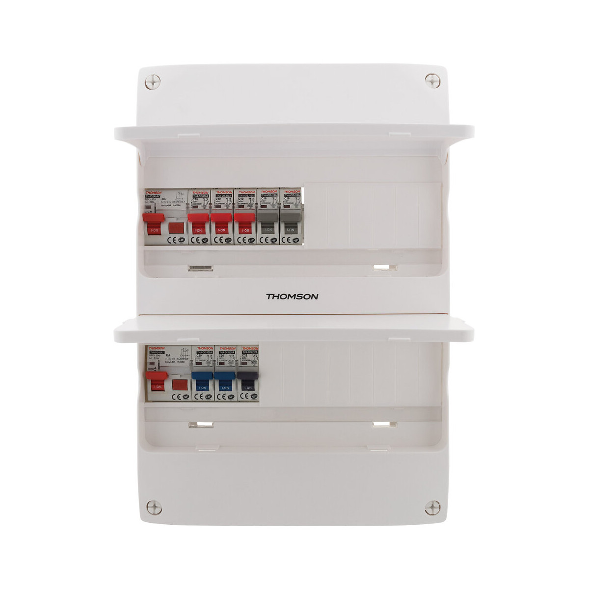 Coffret électrique 2 rangées prééquipé 8 disjoncteurs et 2 interrupteurs différentiels - Thomson Ce tableau électrique 2 rangées est prééquipé pour vous assurer une installation rapide. Il est livré équipé de 8 disjoncteurs à bornes automatiques: 3x10A, 2x16A, 2x20A, 1x32A et de 2 interrupteurs différentiels: 1x40A type AC, 1x40A type A. Caractéristiques: 2 rangées 8 disjoncteurs à bornes automatiques: 3x10A, 2x16A, 2x20A, 1x32A 2 interr. diff.: 1x40A type AC, 1x40A type A. 2 peignes d'alimentation pur borne à vis et autoclip Norme: CE Marque: ThomsonSpécifications techniques