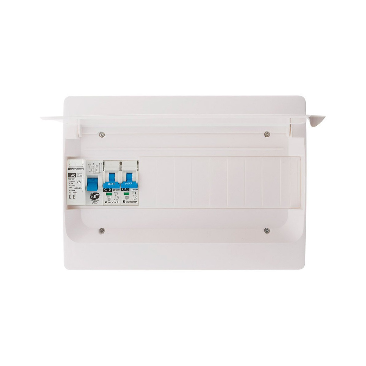 Coffret électrique pré-équipé 1 rangée 13 modules pour extension - Zenitech Ce tableau électrique composé de 1 rangée et 13 modules est pré-équipé et prêt à installer. Il est particulièrement recommandé dans le cadre d'une extension. Compatible GTL, il est livré avec un rail din métal, des obturateurs, bornier de terre et étiquettes de repérage des circuits et pictogrammes. Equipé de 2 disjoncteurs 10A et 16A et d'un interrupteur différentiel 40A type AC, il bénéficie de la norme NF pour les modulaires et est conforme à l'amendement n°5 NFC15-100. Caractéristiques: 1 rangée, 13 modules 1 disjoncteur 10A et 1 disjoncteur 16A 1 interrupteur différentiel 40A type AC Compatible GTL Norme NFSpécifications techniques