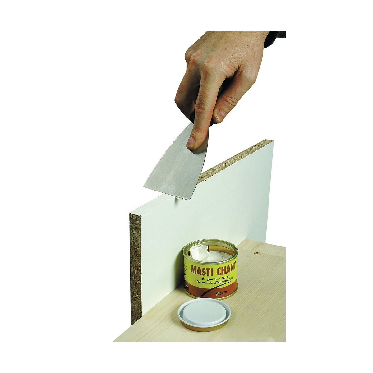 Mastic blanc pour finition facile des chants de panneaux agglomérés. Possibilité de peindre après ponçage.