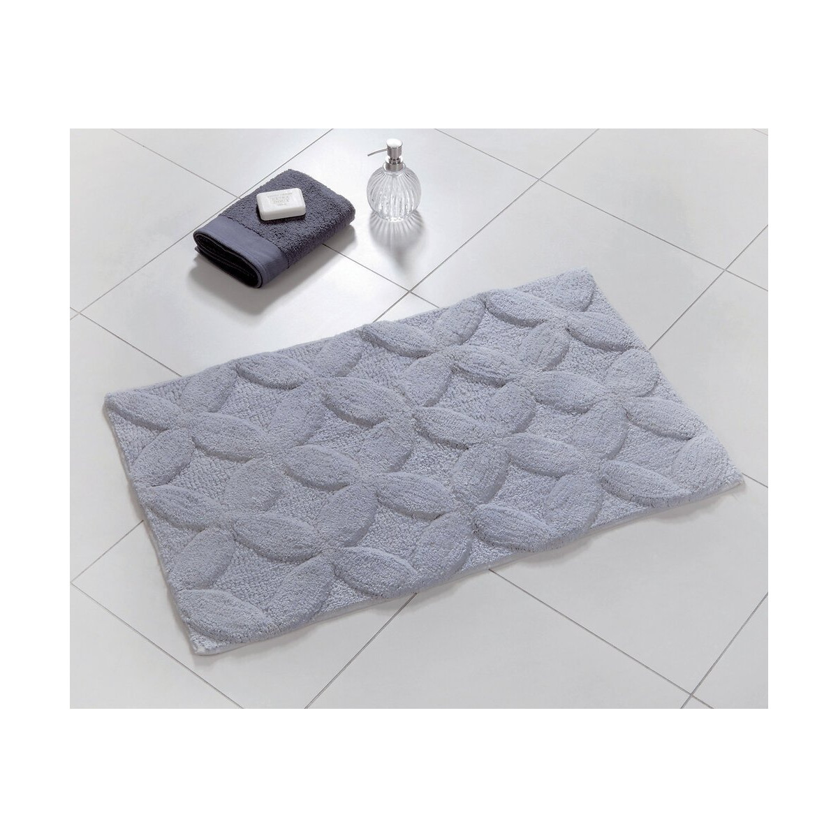 Tapis de bain Flower 100% coton. Coloris gris silver. Dos avec spray latex antidérapant. 2 hauteurs de poils : 22mm et 30mm pour un bel effet relief du décor. Lavable en machine à 30°C en cycle délicat. Dimensions : Largeur 50cmx80cm.Spécifications techniques