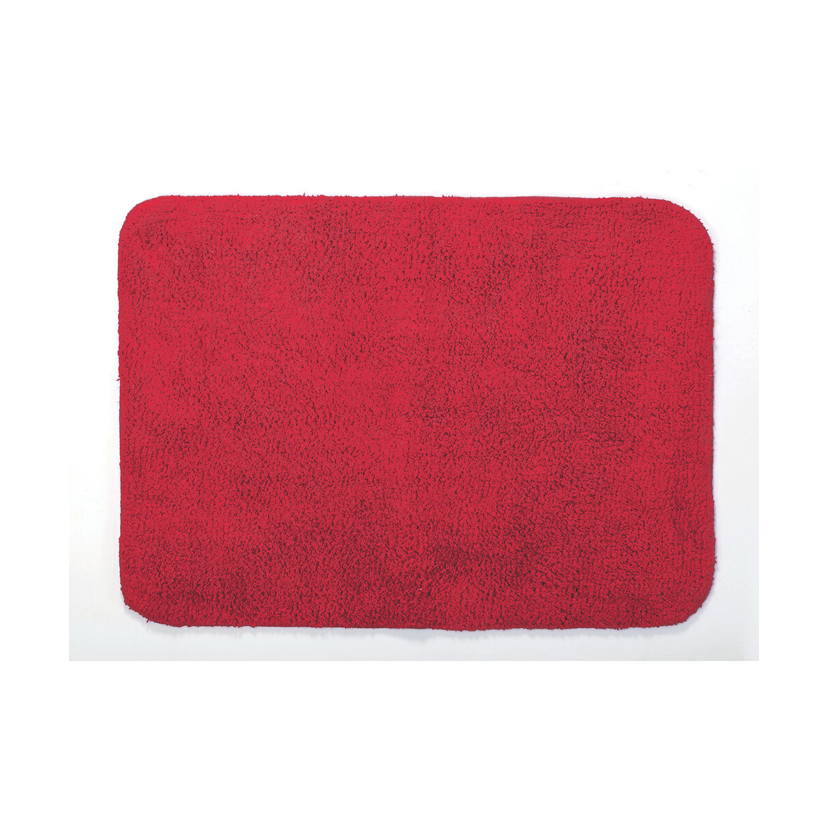Tapis de bain Campus 100% coton. Coloris rouge. Hauteur de poils : 10mm. Lavable en machine à 30°C en cycle délicat. Largeur 50cm. Longueur 70cm.