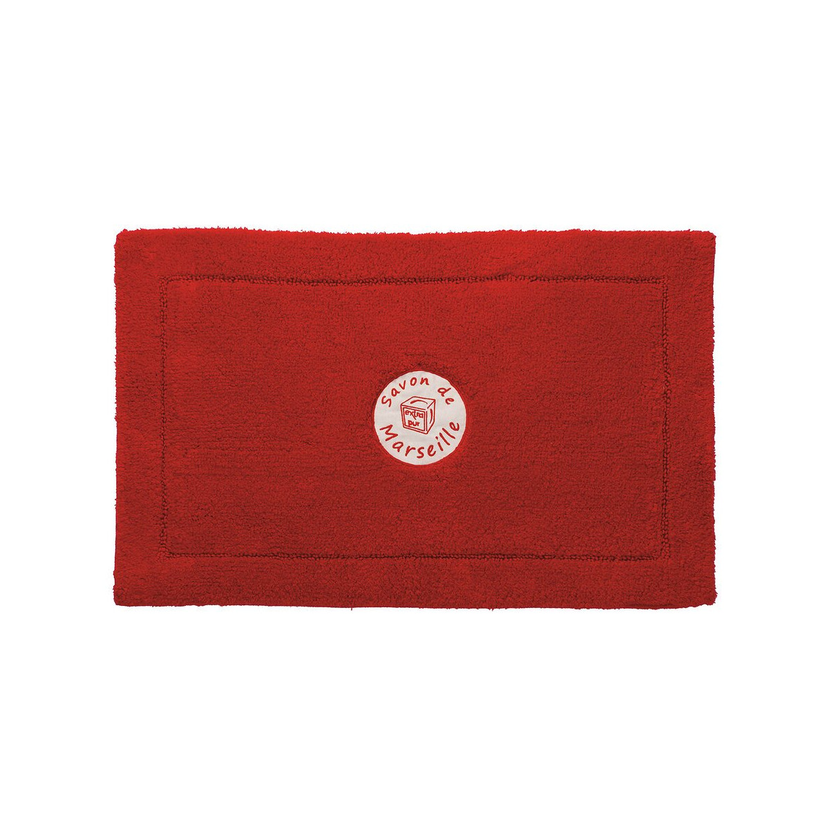 Tapis de bain Frioul 100% coton. Coloris rouge. Décor marque déposée "Savon de Marseille". Dos avec spray latex antidérapant. Hauteur de poils : 12mm. Lavable en machine à 30°C en cycle modéré sans essorage. Dimensions : Largeur 50cmxLongueur 80cm.Spécifications techniques