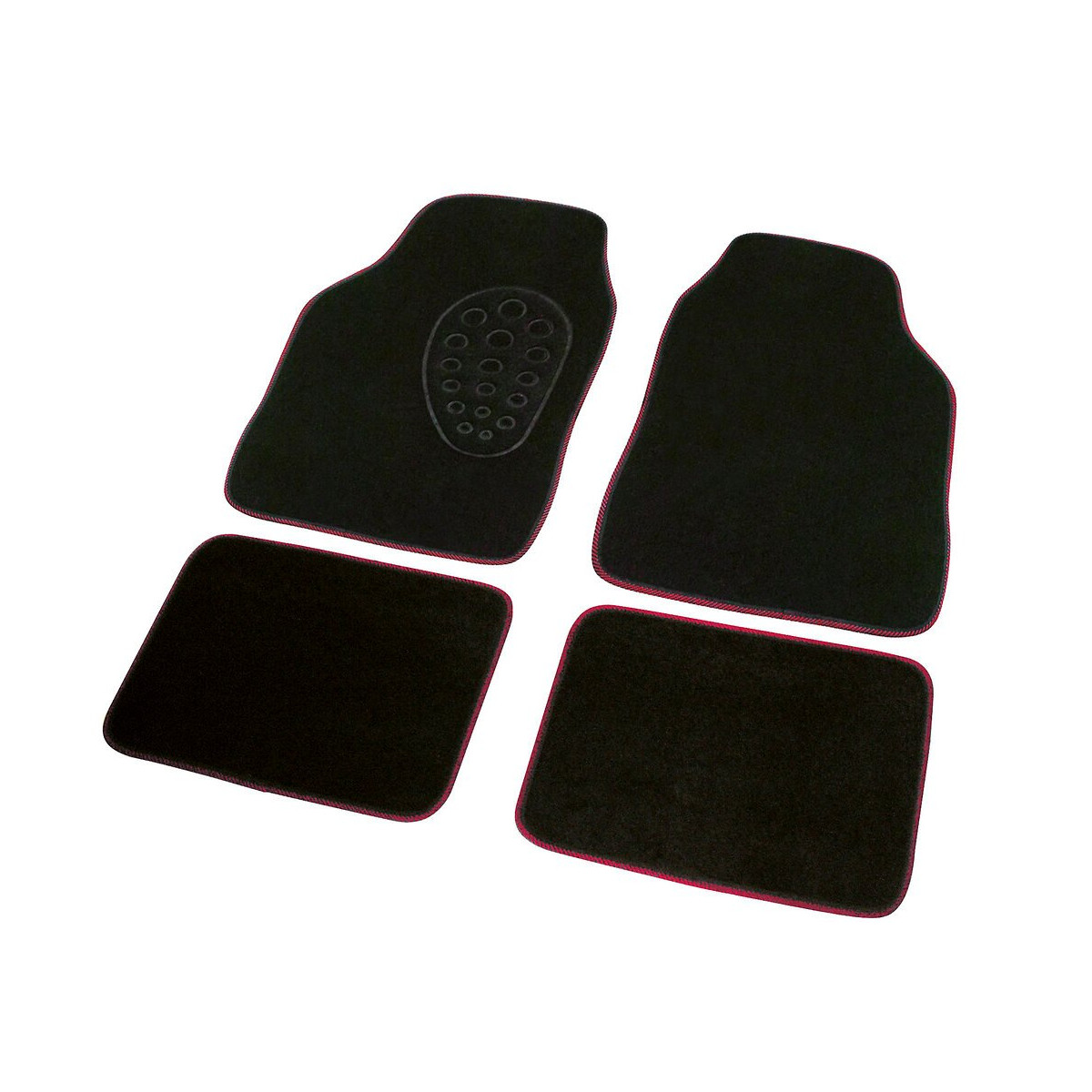 Ces 4 tapis avec broderie chinée noir et rouge protègent la moquette d'origine de votre voiture. Picots PVC antidérapants. Matière moquette noire 100% polypropylène 450g/m². Dimensions avant : 93x61 cm. Dimensions arrière : 38x26 cm.