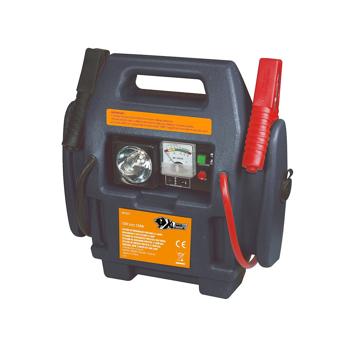 Puissance 800A, 12 A/h Parfait pour l'alimentation et le démarrage des batteries 12V auto ainsi que pour les équipements utilisés occasionnellement : bateau, moto, etc. - Station munie d'une alimentation 12V, type prise allume-cigare, avec protection automatique, permettant de recharger des appareils fonctionnant en 12V tel que lampe, aspirateur, portable, glacière - Equipée d'une lampe.