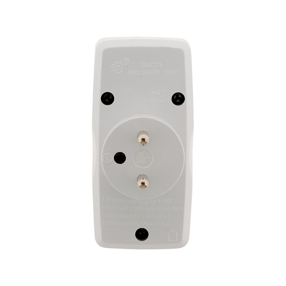 Biplite 1 prise 2P 6A et 1 prise 2P+T 16A + chargeur USB avec 2 sorties. Idéal pour branchement des lecteurs MP3, appareils photo numériques, caméras numériques, agendas électroniques, jeux vidéos portables, lecteurs DVD portables. Possède un indicateur de tension.