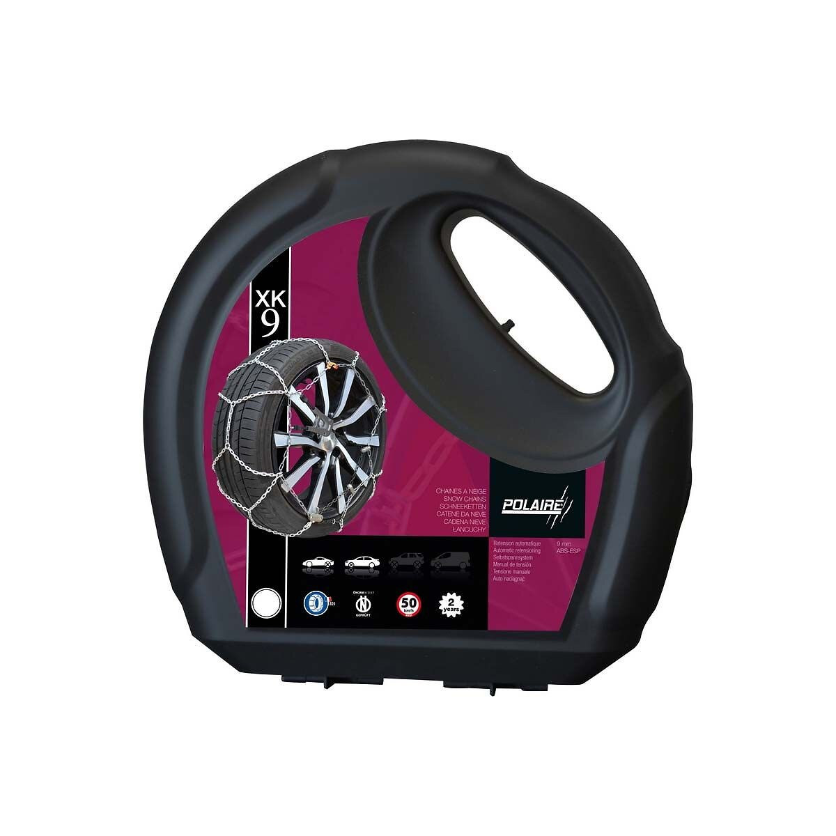 Paire de chaines à neige pour voiture de tourisme à retension automatique assurant la meilleure tenue de route possible. Non compatible avec véhicules non chainables, 4x4, Suv, Camping car et Utilitaires. Installation des chaînes neige voiture des plus faciles pour un montage simplifié quelque soit les conditions d'enneigement. Aucune tension manuelle après le démarrage de votre voiture. Chaines homologuées au panneau B26 du code de la Route. Livrées dans boite rigide avec paire de gants. Chaines hiver automatiques pour pneus 185/65R15 195/50R16 205/40R17 ... Paire de chaines neige hiver maillon 9mm automatique Polaire XK livrée dans une boite rigide qualitative incluant une paire de gants et une notice de montage détaillée. Résolument simple et efficace, le montage de vos chaînes à neige automatique Polaire XK 9mm sur vos pneus vous permet de sortir de toutes les situations avec facilité. Chaines neige à tension automatique Polaire XK9 monter sur vos roues motrices. Conforme au panneau B26 du Code de la Route. Chaines auto neige à tension automatique non compatibles avec les véhicules déclarés non chainables, avec les 4 roues motrices, les Utilitaires et les Camping Car, les Suv et monospace (la traction et la charge de ces véhicules nécessitent des chaines neige de 13 ou 16mm). Ne pas circuler à plus de 50 km/h - Ne pas utiliser sur route sèche (non enneigée ou non verglacé). S'assurer de la bonne pression des pneus (conformément aux recommandations constructeur) Dimensions de pneus correspondant à ces chaines neige pour voiture: 165/75R15 - 165/80R15 - 175/55R17 - 175/70R15 - 175/75R14 - 175/80R14 - 180/65R390 - 185/55R16�- 185/65R15 - 185/70R14 - 185/80R13 - 190/65R14 - 195/45R17�- 195/50R16 - 195/55R15 - 195/60R15 - 195/620R420 - 195/65R14 - 195/70R13 - 195/75R13 - 200/55R365 - 200/60R365 - 205/40R16 - 205/40R17 - 205/50R15 - 205/60R14 - 205/65R13 - 210/55R14 - 210/55R365 - 215/35R17 - 215/40R16 - 215/45R15 - 215/55R14 - 215/60R13 - 225/35R16 - 225/40R15 - 225/50R14 - 225/55R13 - 245/35R16 - 275/45R13 - Montage: Notice de pose des chaines à neige fournie incluant une paire de gants. Tension: Automatique Matériau: Acier haute résistance zingué Type de montage: Cliquet Chaines neige homologuées: Conforme à la réglementation B26 (article R60 du Code de la Route). Compatibles uniquement avec Véhicules de Tourisme. Restrictions d'usage: Non compatibles avec les 4x4, Suv, monospaces ou Véhicules Utilitaires. Type de démontage: Manuel Encombrement côté intérieur de la roue: 9 mm Garantie: 2 ans Type véhicule: Véhicule Tourisme Compatible avec les véhicules non chainables: Non Encombrement sur bande de roulement du pneu: 9 mm Hauteur: 55