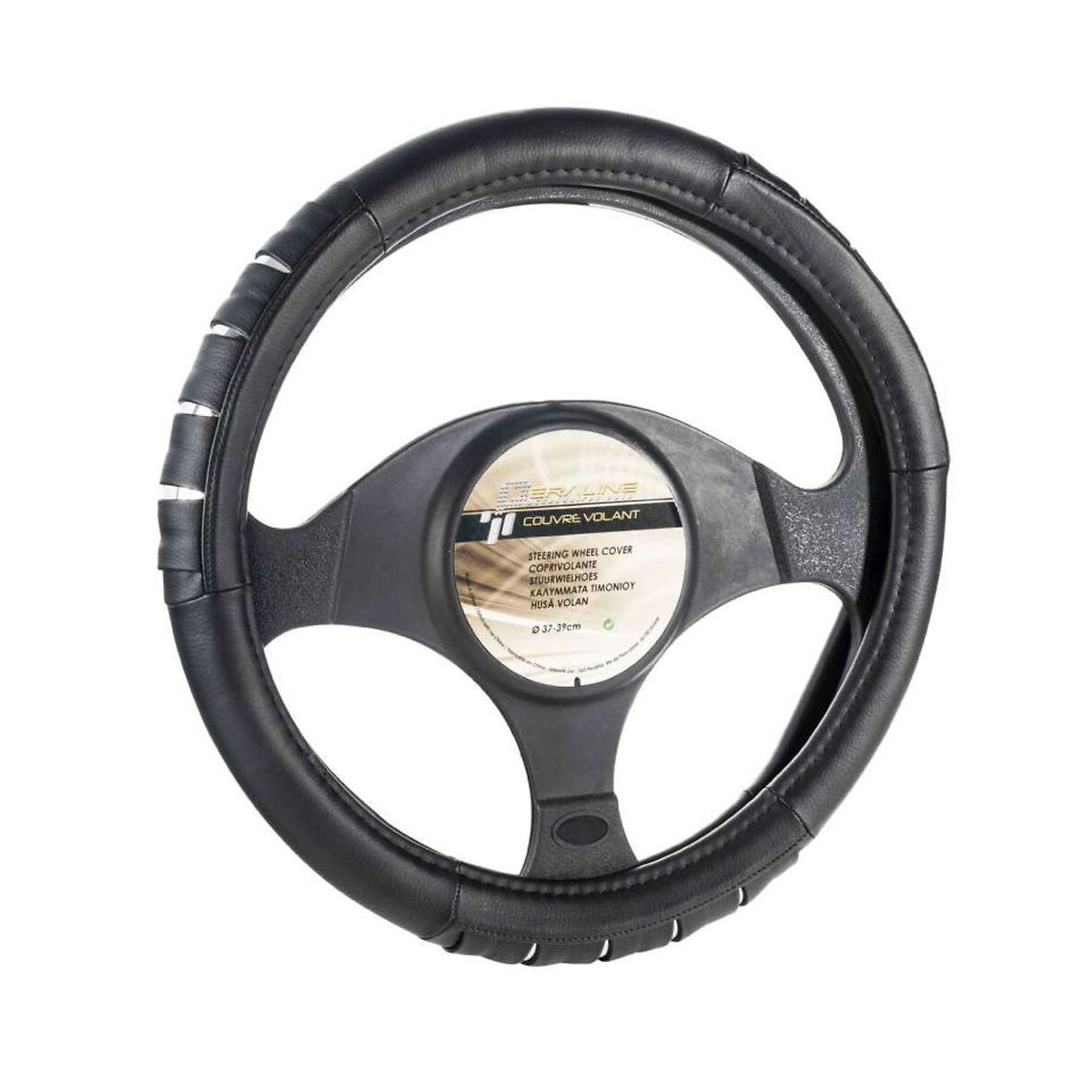 Un nouveau design sportif pour votre auto c'est possible avec ce couvre volant de finition aspect cuir noir et chromé, couture de belle facture. Prise en main confortable pour de longues heures.