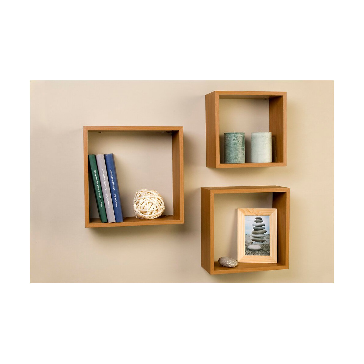 Triple cube coins rectangulaires. MDF avec finition de PVC. Couleur chêne. Dimensions 30x30 -27x27 -24x24 cm. Profondeur 12 cm. Epaisseur 12 mm. Résistance maximum 5 kg