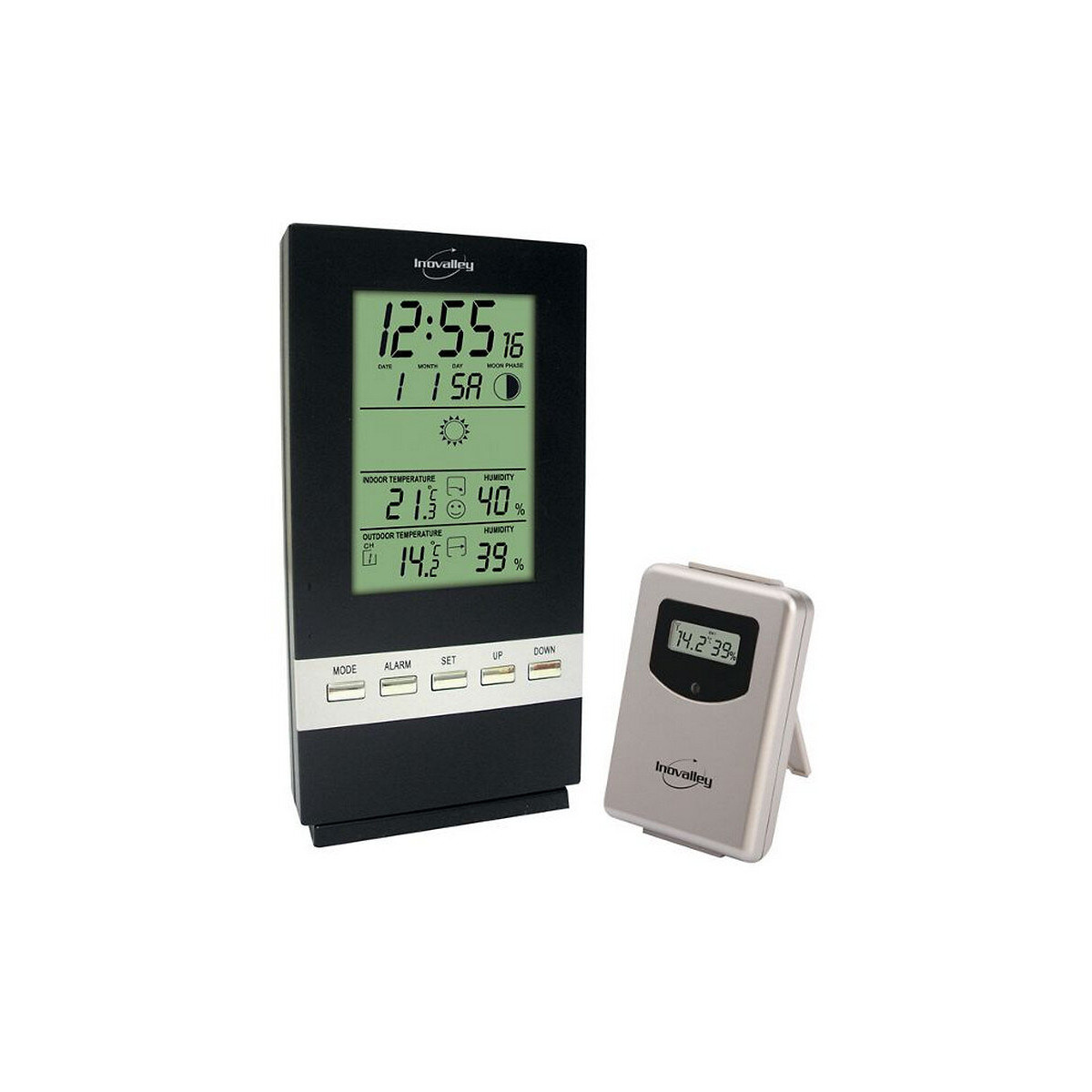 sm300 - Station météo sans fil INOVALLEY SM300 livré avec 1 émetteur extérieur. Prévisions météo par icônes : ensoleillé, légèrement nuageux, nuageux ou pluvieux. Température et hygrométrie intérieure et extérieure. Tendance des pressions. Phase lunaire. Calendrier et horloge. Fonction réveil avec alarme. Indication zone de confort. - Type de produit : Sation météo. Nombre d'émetteur fourni : 1. Coloris : Noir. Dimensions 16.5 x 8.6 x 2.2 cm.
