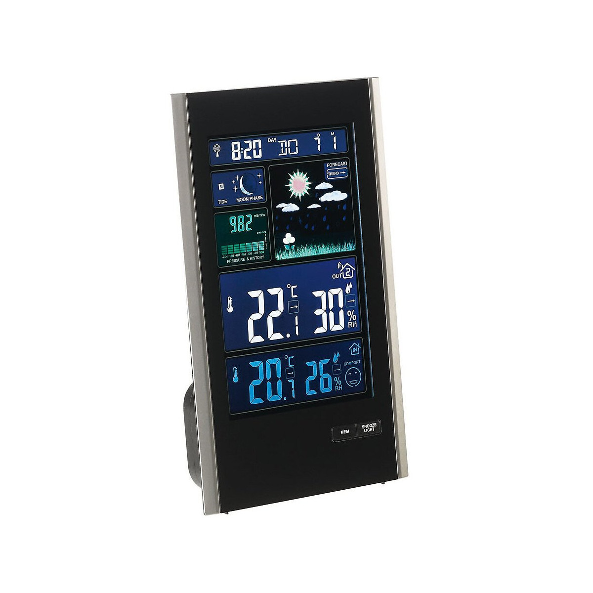 sl250 noir - Station météo barométrique radio-pilotée avec sonde extérieure sans fil Clipsonic SL250, thermomètre et hygromètre intérieur et extérieur, mémorisation des températures et hygrométrie min. et max., indication du niveau de confort et des phases lunaires, prévisions météorologiques par pictos, calendrier perpétuel, alarme, port USB pour chargement des appareils mobiles, portée de transmission jusqu?à 50 m. - Poids brut : 0.37 kg. Dimensions : 18,7 x 11,4 x 6 cm. Piles : oui : 0% mercury - 0% low cadmium. Type de pile : R6 ou AA. Nb de piles : 2. Type de piles 2 : R6 ou AA. Couleur produit : Noir. Secteur : Oui avec adaptateur.