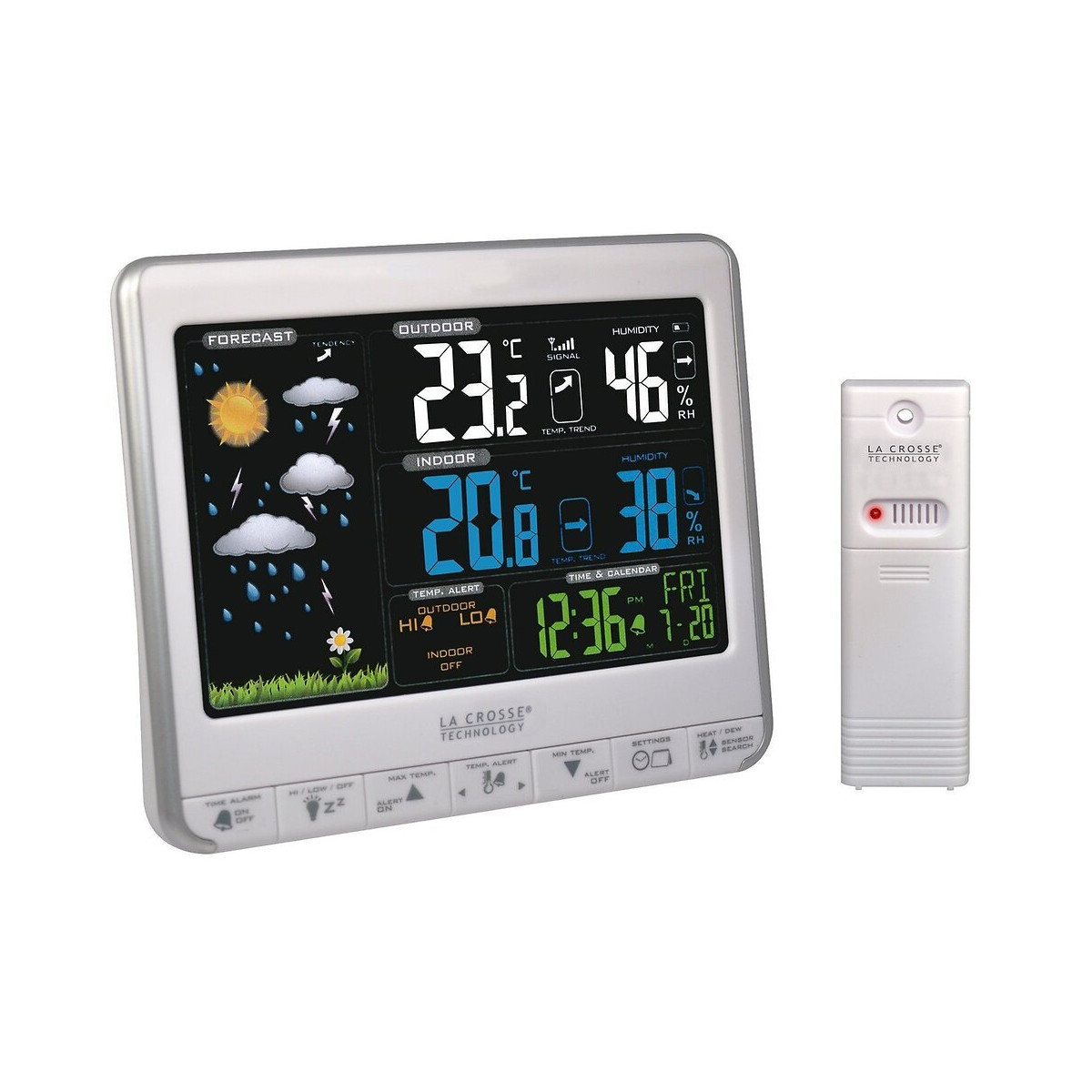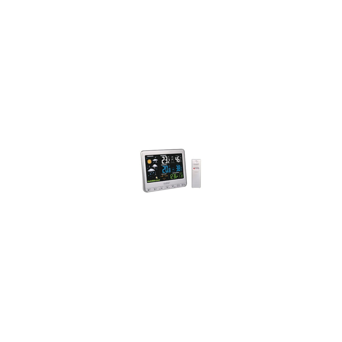 Accessoire(s) inclus : 1 base + 2 piles LR14 1.5V, 1 transmetteur + 2 piles AA LR6 1.5V Anémométrie : Non Autre(s) fonction(s) : Alarme avec snooze, alertes programmables de températures intérieure/extérieure en C° ou F°, point de rosée, indice de chaleur Barométrie : Non Couleur : Blanc / Silver Distance De Transmission : 90 Double Affichage : Oui Fonction Horloge : Oui Fonction Réveil : Oui Histogramme : Non Horodatage : Non Hygrométrie : Oui Les plus produits : Transmission sans fil via 433 MHz, écran LCD coloré, port de charge USB pour les appareils mobiles, choix de la langue du jour de la semaine, indicateurs de piles faibles, rétro-éclairage d'intensité réglable (haute, basse, OFF) Mémoristion Extremes : Oui Mesure Température : Intérieure et extérieure Mesure UV : Non Nombre D'émetteurs Admissibles : 1 Nombre D'émetteurs Fournis : 1 Phases Lunaires : Non Pluviométrie : Non Précision Température : 0.1 Prévision Météo : Oui Prises Des Mesures : Sans fil Rétro-Eclairage : Oui Type de Produit : Station météo