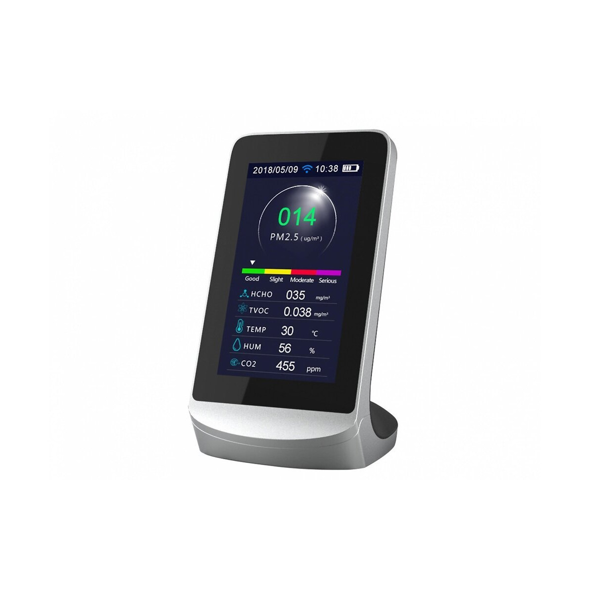 Avez-vous déjà accordé de l'importance à la qualité de l'air que vous respirez? L'AIRTESTER PLUS WIFI de Purline est une station météorologique multifonctionnelle qui vous fournira des informations détaillées et actualisées sur l'humidité, la pollution et la qualité de l'air ambiant. Capable d'être utilisé à l'intérieur comme à l'extérieur, ce produit complet dispose d'un écran LCD numérique avec 5 graphiques et 8 fonctions différentes grâce auquel vous pouvez connaître l'indice des particules fines PM2,5 et PM1,0, le CO2 et le formaldéhyde, dispose également de l'indicateur universel de l'indice de qualité de l'air. En supplément, vous pouvez connaître la météo et profiter de sa connexion internet WIFI pour avoir toutes ces données en temps réel via votre smartphone et votre tablette. Ce compteur d'air est alimenté par une batterie au lithium qui peut être rechargée avec le câble USB inclus. Ses dimensions (LxlxH: 10c8x15 xm) et sa légèreté (0,5kg) font de ce design moderne un outil indispensable que vous pouvez utiliser et déplacer selon vos besoins.