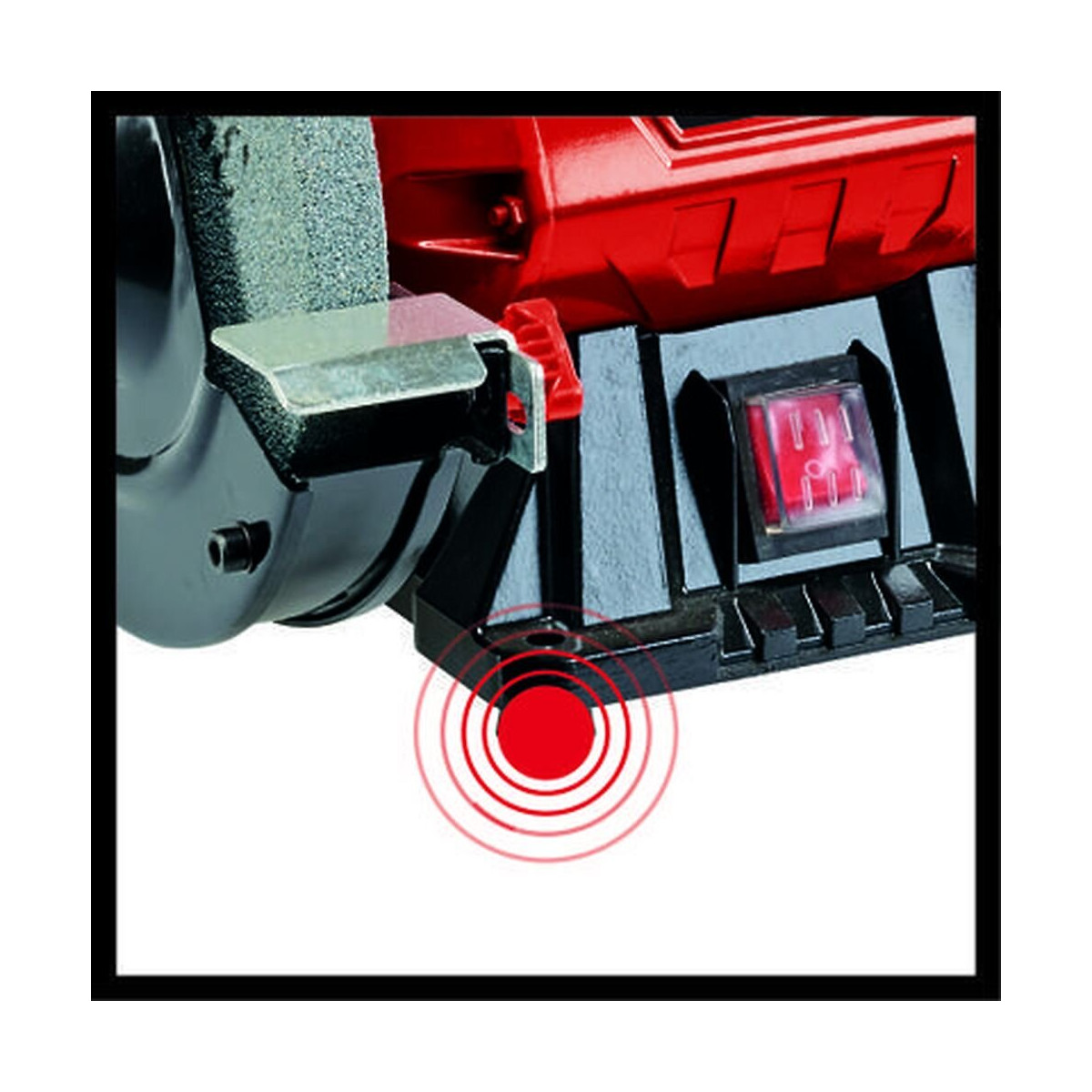 Le touret à meuler TC-BG 150 Einhell est une meuleuse très pratique et polyvalente. Les tourets à meule double, dans lesquels chaque meule est entraînée par un moteur, font partie de l’équipement de base au sein d’un atelier. Ils permettent d’affûter aussi bien les ciseaux, couteaux et lames, que les outils de coupe, forets, et fraises, y compris les burins. Quatre patins en caoutchouc amortissent les vibrations et apportent une bonne stabilité. Une meule de dégrossissage et une meule de ponçage fin (K36/K60) sont fournies de série. Les + du produit 4 patins en caoutchouc anti-vibration pour une bonne stabilité Grands supports de travail ajustables pour différentes applications Pare-étincelles réglables sans aucun outil Bâti métallique compact et robuste pour une longue durée de vie Arbre porte-meule monté sur roulement à billes sans jeu pour un travail précis Capots de protection fermés sur les côtés pour une utilisation en toute sécurité Meule de dégrossissage et meule de ponçage fin (K36/K60) incluses Pour les corrections de forme importantes et les polissages Pour les petites corrections de forme et l’affûtage des lames Caractéristiques techniques Alimentation secteur : 220-240 V | 50 Hz Puissance max (S2 | S2 temps) : 150 W | 30 min Disque de ponçage : 150 mm x 32 mm x 16 mm Grain : 36 / 60 Longueur : 309 mm Largeur : 219 mm Hauteur : 234 mm Poids du produit : 5.885 kg