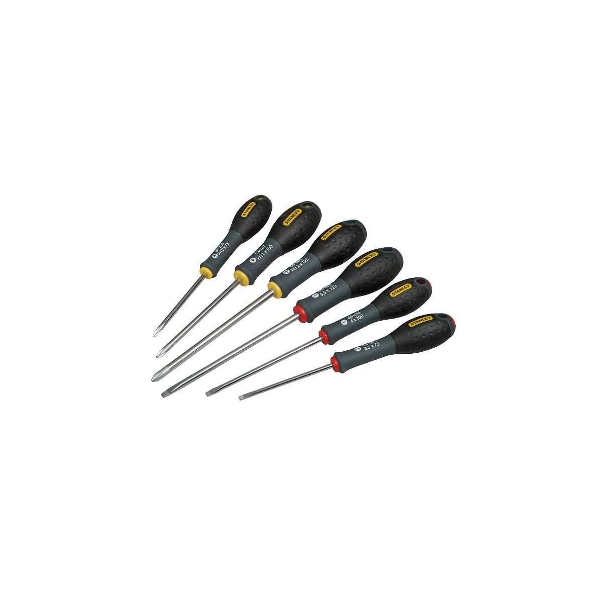 Tournevis conçu pour une utilisation professionnelle intensive, liaison quasiment incassable Lame en acier au chrome vanadium : grande résistance et réduit les risques de casse de la pointe et de la lame Meilleure accroche dans la tête de vis grâce au sablage de l'empreinte Poignée en soft grip antidérapant, ergonomique offrant une force de serragee maximum et diminution du risque de fatigue Marquage du type, de la taille de l'empreinte ainsi que de la longueur de la lame sur le manche - code couleur Jeu de 6 pièces : Electricien 3.5x75, 4x100, 5.5x125. Phillips PH0x75, PH1x100, PH2x125 mm