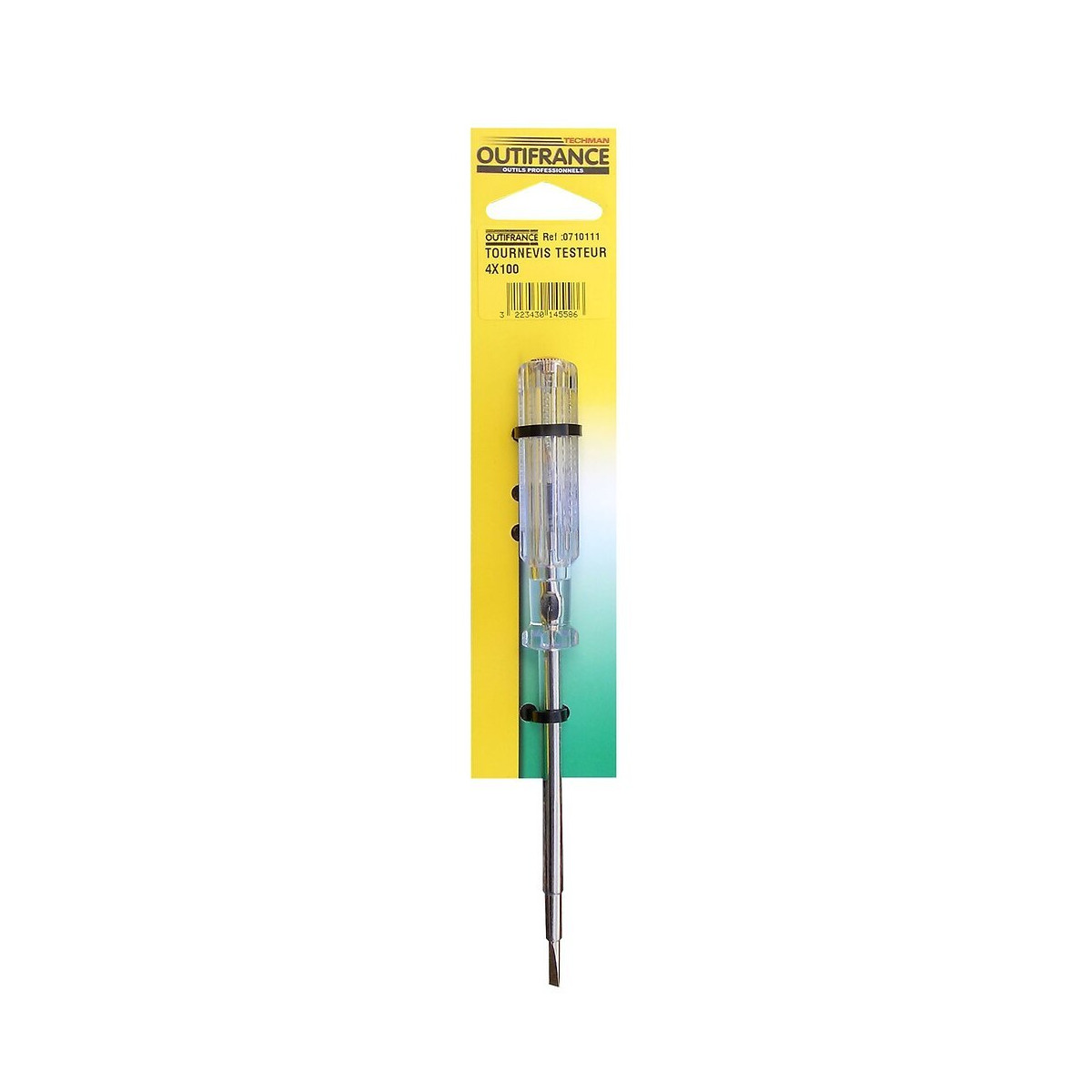 Tournevis testeur à lame plate - grand modèle 4 x 100. Lame isolée. Manche plastique transparent. Equipé d'un témoin lumineux.