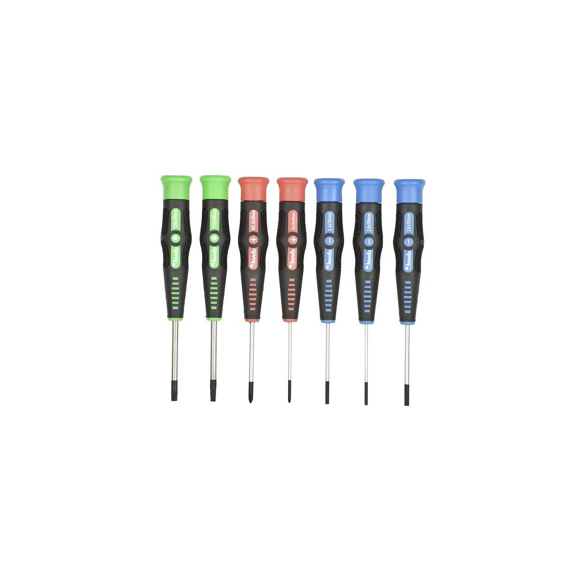 Jeu de 7 tournevis PRO de précision , en cassette plastique. Cet article comprend: Tournevis fente: 2.0, 2.5, 3.0 mm Tournevis Phillips: Nr. 00, Nr. 0 Tournevis Torx: T15, T 20