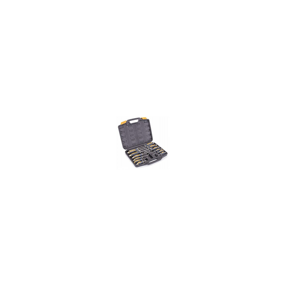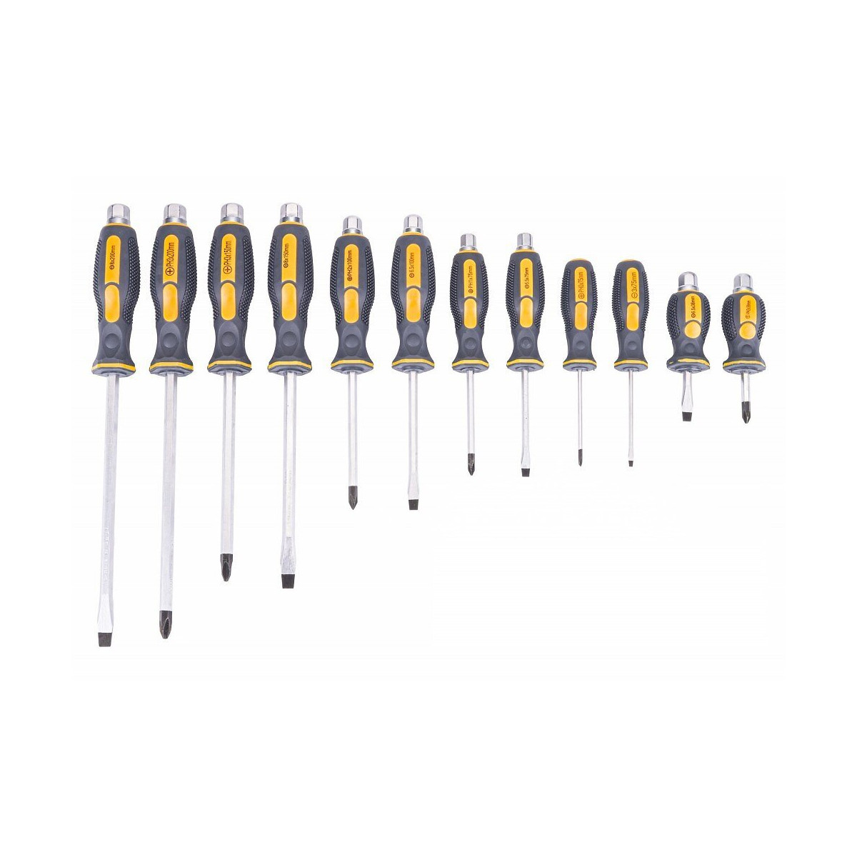 Jeu de tournevis essentiels 12 pièces. L'utilisation des embouts aimantés permet d'augmenter la précision et les possibilités de vissage dans les endroits difficiles d'accès, CARACTÉRISTIQUES TECHNIQUES: Tournevis traditionnels: 5 plats (8x200mm, 8x150mm, 6,5x100mm, 5,5x75mm, 6,5x38mm), 5 croix (PH3x200mm, PH3x150mm, PH2x100mm, PH1x75mm, PH2x38mm), 1 plat (3x75mm), 1 croix (PH0x75mm), Tête aimantée, Embouts métalliques