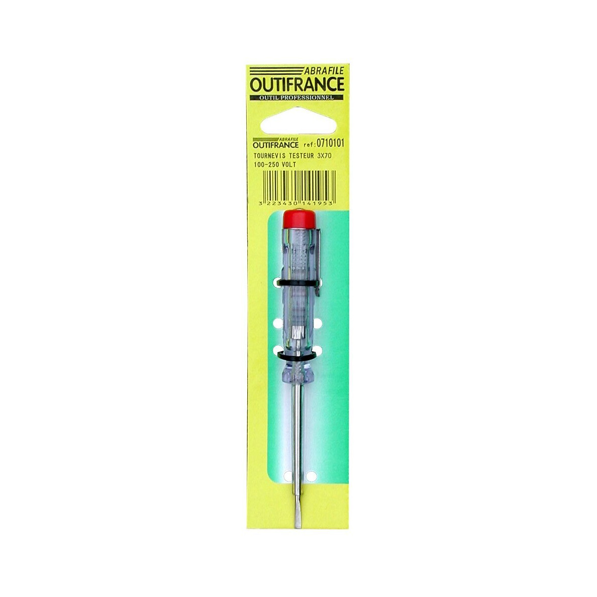 Tournevis testeur à lame plate - petit modèle 3 x 70. Lame isolée. Manche plastique transparent. Equipé d'un témoin lumineux.