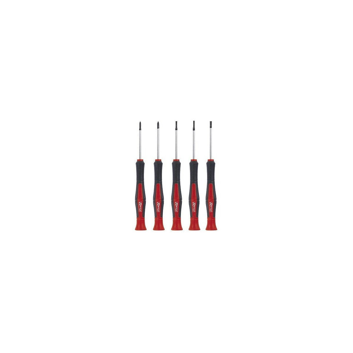 Idéal pour tous les travaux minutieux ou la précision et la finesse sont requises : maquettisme, électronique, horlogerie, informatique... Lame au chrome vanadium à tête aimantée, longueur ± 50 mm. Manche ergonomique bi-matière à revêtement antidérapant, avec embout rotatif, longueur ± 95 mm. 3 pour vis à fente : 2, 2.5, 3.0 - 2 Phillips : PH00, PH0. Lot de 5 tournevis