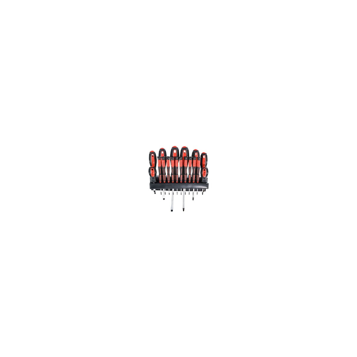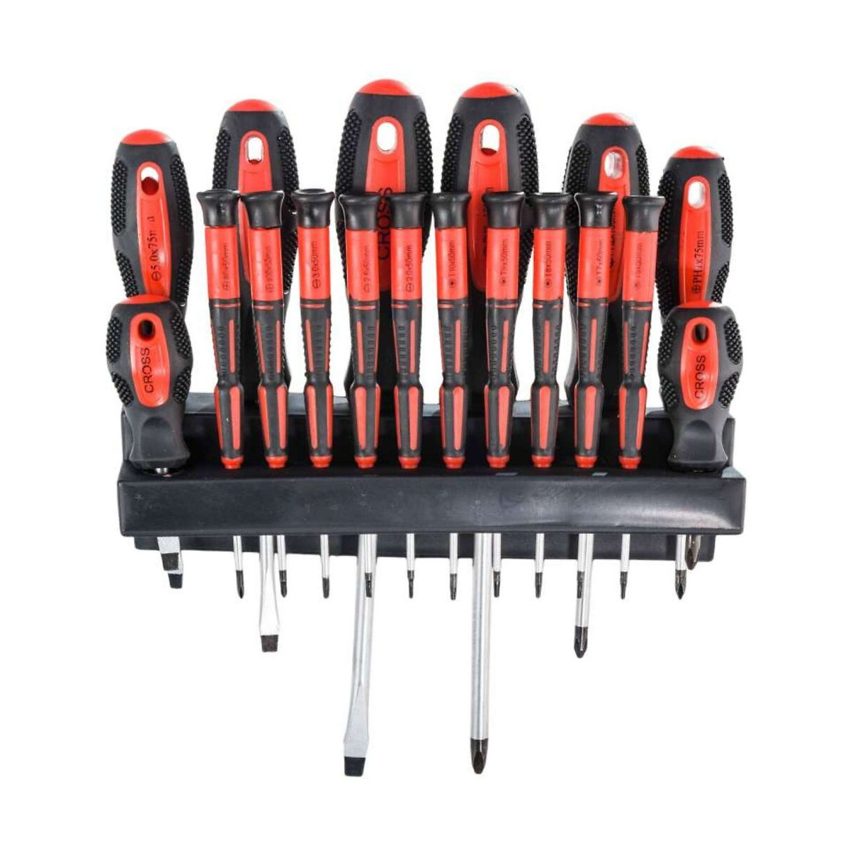 Description détaillée du produit Produit: Tournevis bi-matière avec support Conditionnement: 18 pièces Composition: 3 plats, 3 cruciformes, 2 courts plat et cruciforme + 10 tournevis de précision Fixation murale Coloris: rouge et noir Marque: Cross