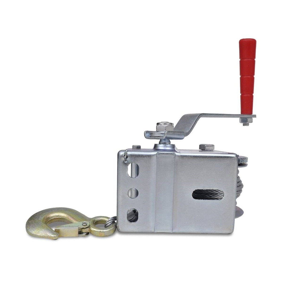 Ce treuil à main 363 kg / 800 lbs est un outil idéal pour tirer ou soulever des objets volumineux ou lourds. Ce treuil à main de haute qualité, avec un câble de 10 m de longueur, est extrêmement robuste.Grâce au fer de qualité utilisé pour sa construction, il est très durable.Ce treuil à main de haute qualité est parfait pour une utilisation sur des camionnettes, des remorques et d'autres applications mobiles. Vous pouvez consulter notre site pour le support de treuil pour remorque de bateau (SKU 90634) pour un set complet. Matériaux:Fer Dimensions:28 x 25 x 12 cm (L x P x H) Capacité:363 kg / 800 lbs Diamètre du câble:4 mm Longueur du câble:10 m Rapport de transmission:3,2 : 1 Dimensions du crochet:85 mm 1 sens / 1 vitesse
