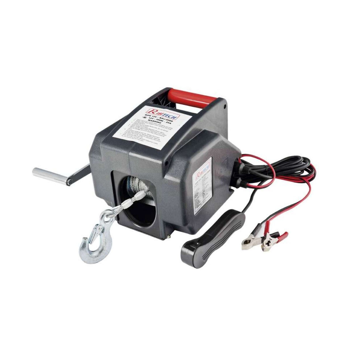 Ce treuil est très pratique pour tirer des bateaux, véhicules ou tout autre gros objet. Support de montage sur accroche remorque. Treuil voiture 5 tonnes, 12 volts, 300 watts. Livré complet avec: 9 m de câble. crochet de sécurité, télécommande filaire pour le treuil Marche AV Poulie de mouflage.