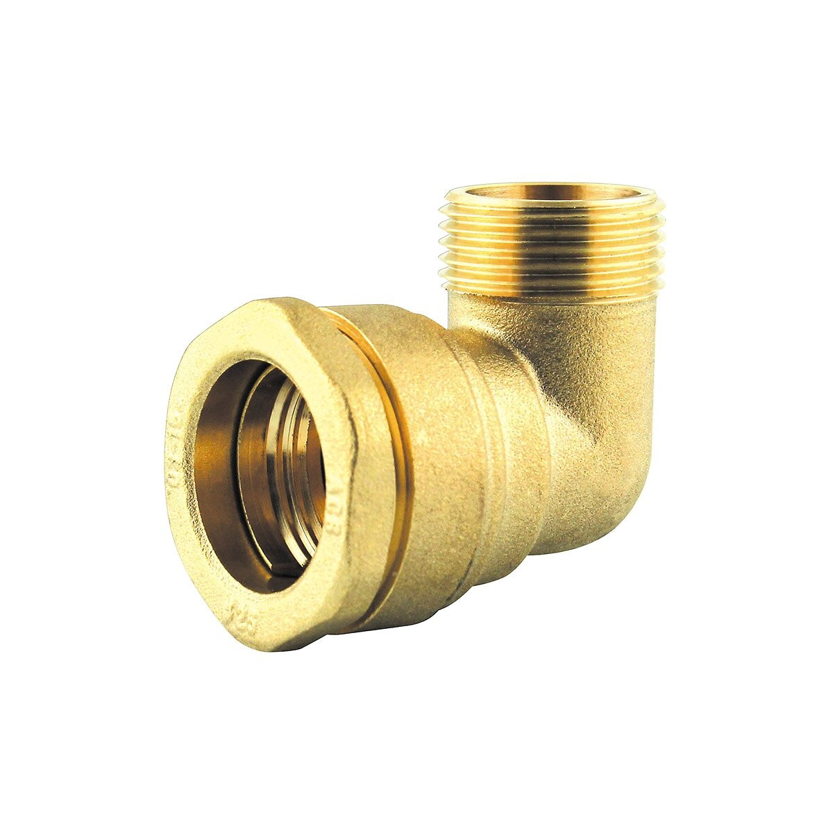 Caractéristiques : - Utilisés pour l'adduction d'eau potable et l'irrigation. - Certification ACS, norme DIN 8076 et filetage ISO228/1. - Corps en laiton matricé CW617N, bague crantée en laiton H62, joint torique EPDM. - Conditions d'utilisation : températures comprises entre 0°C et 50°C / pression PN20. Descriptif technique : - Pression nominale : PN20. - Matière : laiton. - Diamètre : 25x3/4". - Angle : 90°. - Attestation de conformité sanitaire. - Raccordement : fileté. - Marque : Interplast.Spécifications techniques