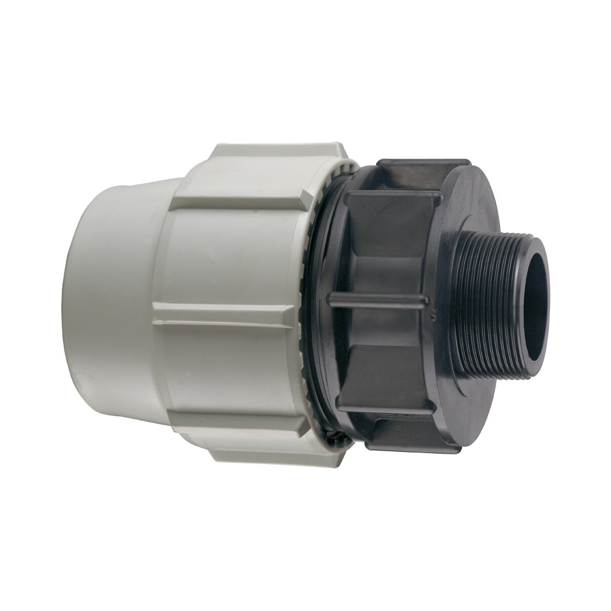 Raccord à compression fileté mâle pour tuyau en polyéthylène et PVC normés. Raccord mécanique utilisé pour l'assemblage de tubes en pression. Corps et écrou en polypropylène et copolymère de haute qualité. Dimensions : Diamètre 32/26 mm x 34 mm. Bague de crampage en acétal (POM). Joint torique en caoutchouc nitrile (NBR).Pression maximale de service : PN 16 bars à 20°C. Température de service : jusqu'à 40°C. Avantages : - Attestation de Conformité Sanitaire. - Excellente résistance à l'arrachement. - Montage rapide et facile. - Parfaite résistance à la corrosion : tenir compte pour les liquides corrosifs de la nature du joint torique (caoutchouc nitrile). Remarques importantes : application eau chaude exclue.Instructions d'installation pour les raccords à compression : pour les raccords 16 mm à 63 mm, dévisser l'écrou jusqu'au dernier filet. Enfoncer le tube en tournant dans le raccord (utilisation du lubrifiant et du cône à chanfreiner). Visser et serrer l'écrou fermement (clé Plasson).Pour les raccords 75 mm à 110 mm, dévisser l'écrou de 3 à 4 tours. Enfoncer le tube jusqu'à la butée intérieure du raccord (utilisation du lubrifiant et du cône à chanfreiner). Visser l'écrou au maximum et serrer fermement (clé Plasson).