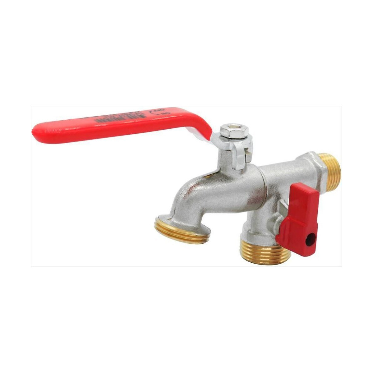 Equipé de deux sorties pour y relier plusieurs équipements en même temps Robinet d'arrosage pourvu d'une entrée mâle 15x21 et de deux sorties mâles 20x27 avec vannes 1/4 de tour pour ouvrir ou couper facilement l'alimentation. Peut alimenter en eau deux tuyaux d'arrosage en même temps ou un seul tuyau afin de garder le robinet accessible pour d'autres usages. Destination: Pour l'eau Matière principale: Laiton Filetage d'entrée (en mm): 15 x 21 Filetage de sortie (en mm): 20 x 27 Pression maximum (en bar): 15 Type d'embout d'entrée V3: 1/2" Type d'embout de sortie V3: 3/4" Norme ou label: ACS Produit emballé : hauteur (en cm): 5.5 Produit emballé : largeur (en cm): 17.8 Produit emballé : profondeur (en cm): 10 Produit emballé : poids (en kg): 0.262 Indication du geste de tri (triman): NonSpécifications techniques