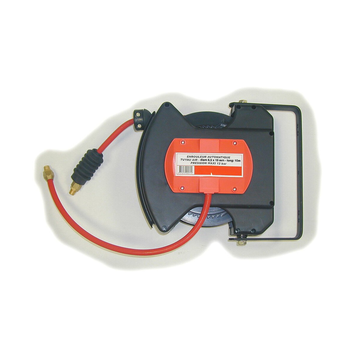 Enrouleur pour tuyau à air à rappel automatique avec support mural avec raccords rapides universels. Contenance : diamètre de 6 mm x 10 mm. Longueur : 10 m.