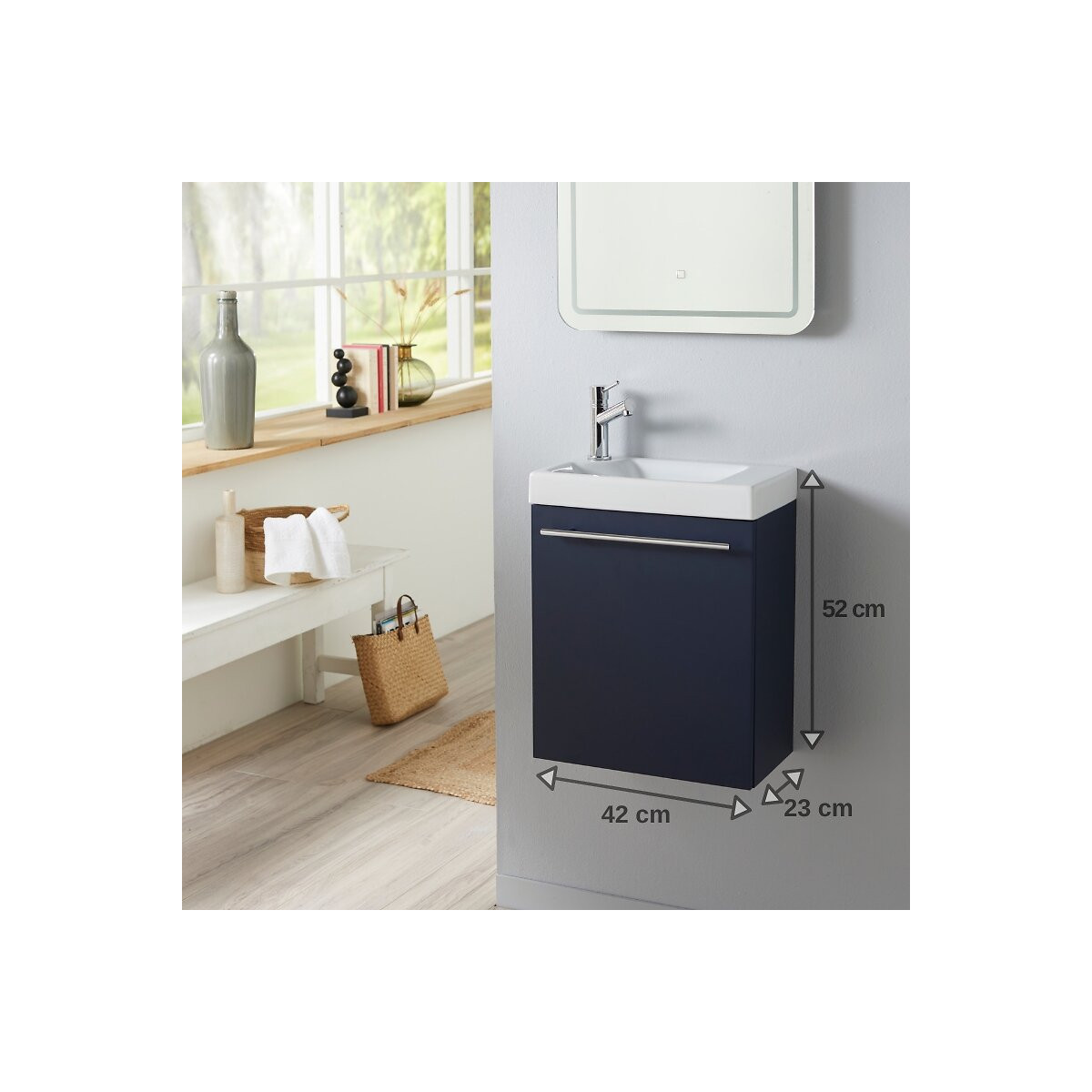 Cet ensemble meuble lave-mains suspendu Hamac couleur Bleu nuit contient : Un meuble couleur bleu nuit + un lave-mains en céramique + une robinetterie eau froide + une bonde + un siphon + un kit de fixation murale. CARACTÉRISTIQUES TECHNIQUES MEUBLE : Meuble en mélaminé finition mate 'Bleu nuit'. Ce meuble est équipé d'un niveau de tablette. La porte réversible est équipée d'une poignée faisant office de porte serviette. Épaisseur du caisson et de la porte 16mm. Meuble monté en usine. Dimensions du meuble seul : L42.5xH47xP23.5 cm. Conseil : Ne fixer la poignée que lorsque vous aurez choisi le sens d'ouverture de la porte. LAVE-MAINS : Lave-mains en céramique blanc. Lave-mains non réversible. ROBINETTERIE : Robinet eau froide. Flexible non inclus.(Raccord mâle 15/21 ou 1/2') Robinet placé à GAUCHE non réversible. VIDAGE : La bonde à écoulement libre et le siphon sont inclus. Fabrication Européenne. PRÉCAUTIONS D'INSTALLATION : La poignée est à monter soi même. Les trous de pré perçage à l 'arrière de la porte sont prévus pour l 'installation de la poignée uniquement à l 'horizontale. Ne fixer la poignée que lorsque vous aurez choisi le sens d'ouverture de la porte. Les meubles doivent être fixés au mur. Utilisez les matériaux de fixation en fonction de vos murs (chevilles et visseries).