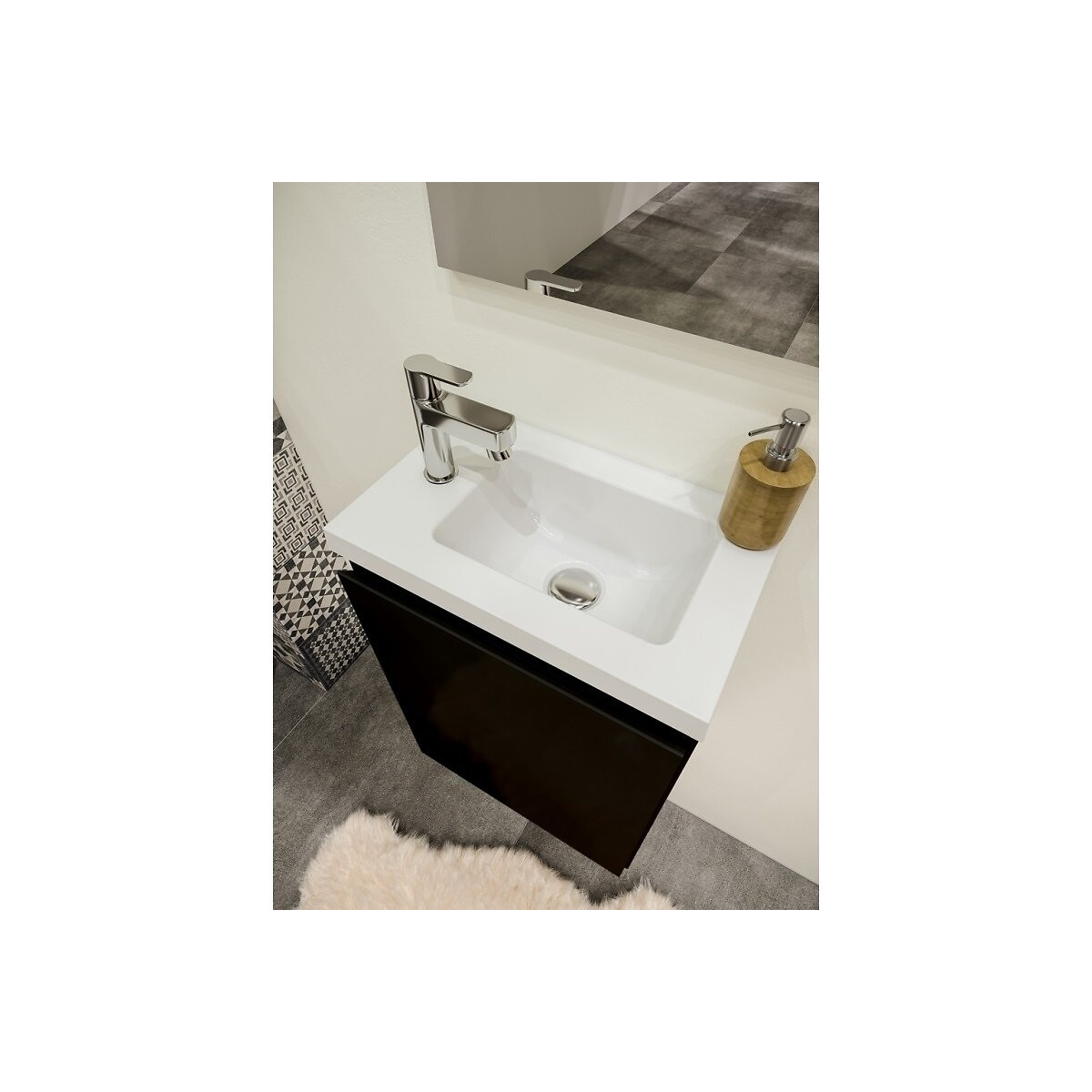 Cet ensemble meuble lave-mains suspendu Porto couleur Noir brillant contient : un meuble + un lave-mains en Polybéton + un miroir CARACTÉRISTIQUES TECHNIQUES MEUBLE : Meuble en mdf couleur 'Noir brillant'. Façades en Mdf 18 mm Épaisseur du caisson et de la porte 18mm Porte avec charnières softclose positionnées à droite, sens d'ouverture de la porte à gauche uniquement. (non réversible) Prise de main directe biseauté Meuble monté en usine Dimensions du meuble : L40xH48xP25 cm Couleur : Noir brillant LAVE-MAINS : Lave-mains en Polybéton blanc. (Matériau de synthèse constitué d'une couche de protection en Gelcoat Acrylique et d'une charge minérale à base de poudre de marbre). Ce lave mains dispose d'une plage de robinetterie, d'une petite plage de dépose sans trop plein. Lave-mains réversible Robinetterie, bonde et siphon non inclus Dimensions du lave mains : L40.2x P25.2x H3cm MIROIR : Dimensions : H51xL40xP2 cm PRÉCAUTIONS D'INSTALLATION : Les meubles doivent être fixés au mur. Utilisez les matériaux de fixation en fonction de vos murs (chevilles et visseries).