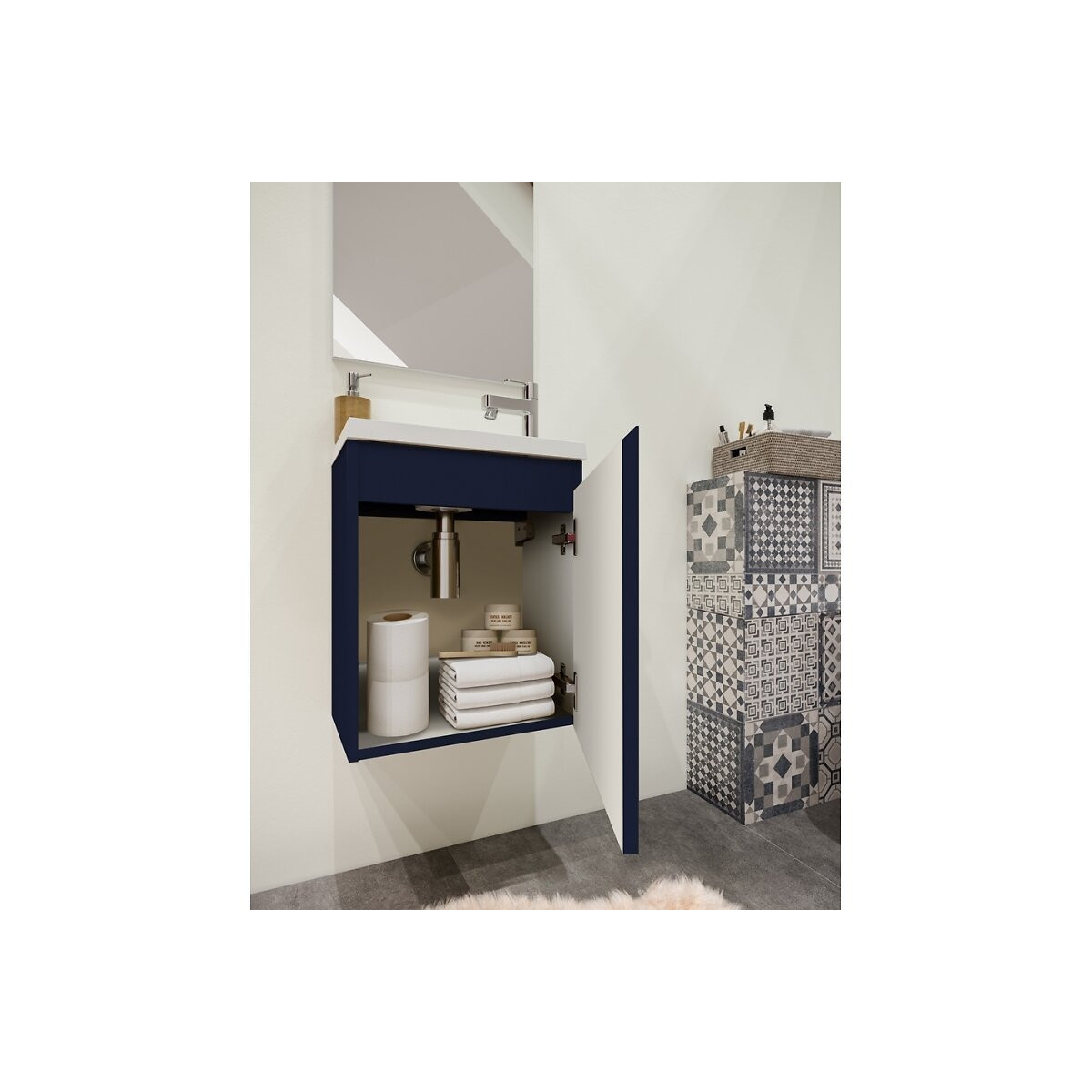 Cet ensemble meuble lave-mains suspendu Porto couleur Bleu nuit mat de marque Allibert contient : un meuble + un lave-mains en Polybéton + un miroir. CARACTÉRISTIQUES TECHNIQUES MEUBLE: Meuble en MDF couleur 'Bleu nuit mat'. Façades en MDF 18 mm. Épaisseur du caisson et de la porte 18mm. Porte avec charnières softclose positionnées à droite, sens d'ouverture de la porte sur la gauche uniquement. (sens d'ouverture non réversible) Prise de main directe biseauté. Meuble monté en usine. Dimensions du meuble : L40xH48xP25 cm. Couleur : Bleu nuit mat. LAVE-MAINS : Lave-mains en Polybéton blanc. (Matériau de synthèse constitué d'une couche de protection en Gelcoat Acrylique et d'une charge minérale à base de poudre de marbre). Ce lave mains dispose d'une plage de robinetterie, d'une petite plage de dépose sans trop plein. Lave-mains réversible. Robinetterie, bonde et siphon non inclus. Dimensions du lave mains : L40.2x P25.2x H3cm. MIROIR : Dimensions : H51xL40xP2 cm. PRÉCAUTIONS D'INSTALLATION : Les meubles doivent être fixés au mur. Utilisez les matériaux de fixation en fonction de vos murs (chevilles et visseries).