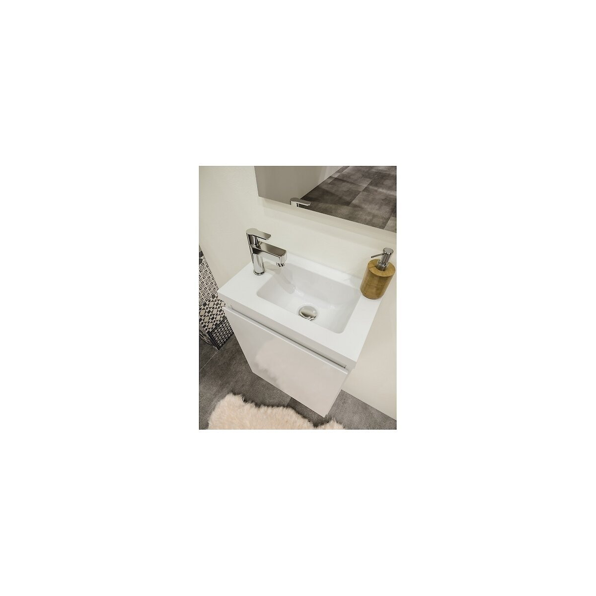 Cet ensemble meuble lave-mains suspendu Porto couleur Blanc contient : Un meuble + un lave-mains en Polybéton + un miroir CARACTÉRISTIQUES TECHNIQUES MEUBLE: Meuble en mdf couleur 'Blanc'. Façades en Mdf 18 mm. Épaisseur du caisson et de la porte 18mm. Porte avec charnières softclose positionnées à droite, ouverture de porte sur la gauche. (non réversible) Prise de main directe biseauté. Meuble monté en usine. Dimensions du meuble : L40xH48xP25 cm. Couleur : blanc brillant. LAVE-MAINS: Lave-mains en Polybéton blanc. (Matériau de synthèse constitué d'une couche de protection en Gelcoat Acrylique et d'une charge minérale à base de poudre de marbre). Ce lave mains dispose d'une plage de robinetterie, d'une petite plage de dépose sans trop plein. Lave-mains réversible. Robinetterie, bonde et siphon non inclus. Dimensions du lave mains : L40.2x P25.2x H3cm. MIROIR: Dimensions : H51xL40xP2 cm. PRÉCAUTIONS D'INSTALLATION : Les meubles doivent être fixés au mur. Utilisez les matériaux de fixation en fonction de vos murs (chevilles et visseries).