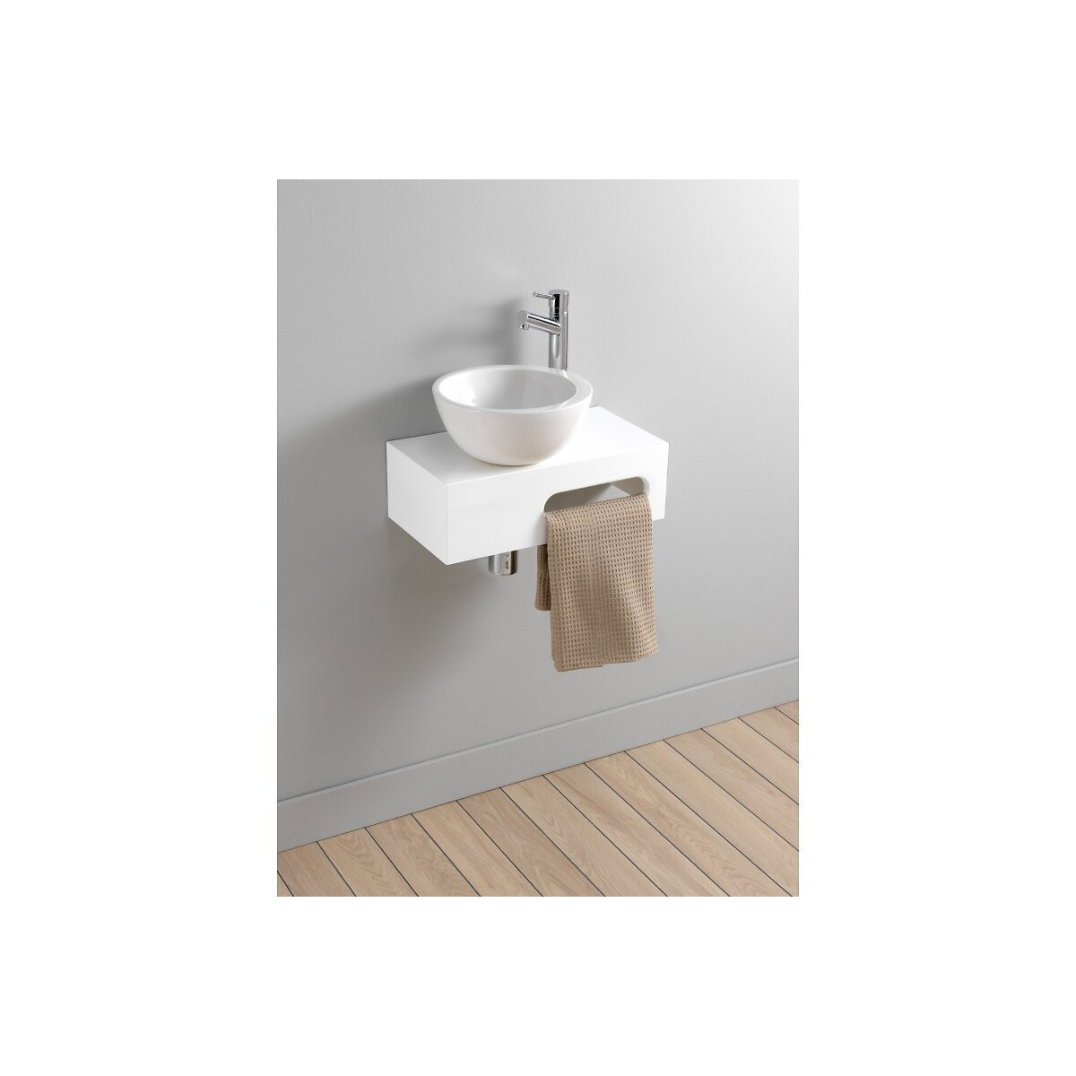 Ensemble prêt à poser! Ce pack contient : - 1 console en mdf laqué blanc brillant - 1 Lave mains bol en céramique blanc diamétre 26 cm / Dimension lave-mains : L 26 x P 26 x H 11,5 cm - 1 bonde chromée - 1 siphon design chrome - 1 kit de fixation mural - 1 robinet eau froide rehaussée, à droite, non réversible. Flexibles non inclus.