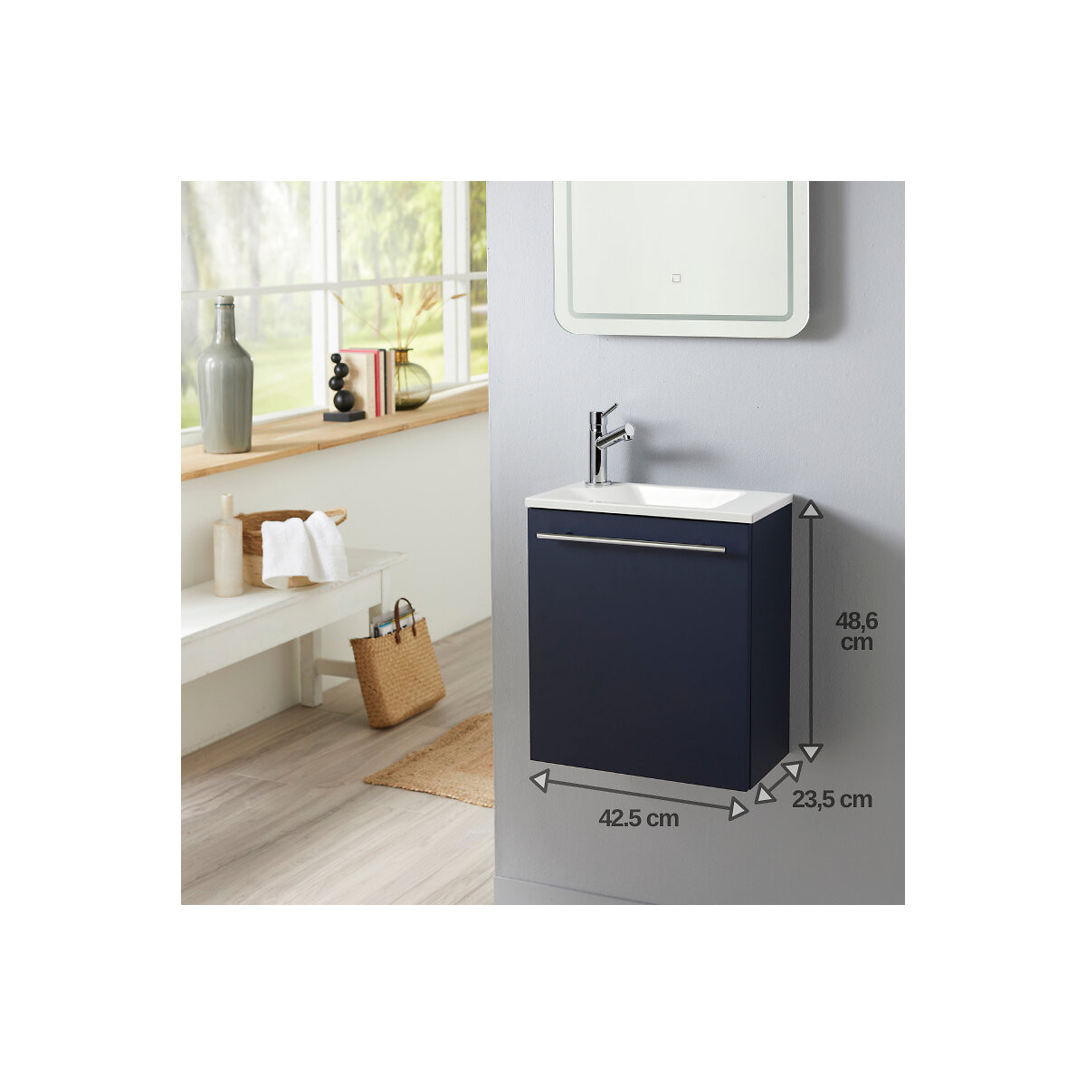 Cet ensemble meuble lave-mains suspendu Hamac couleur Bleu nuit contient : Un meuble couleur Bleu nuit + un lave-mains en Solid stone blanc + une robinetterie eau froide + une bonde + un siphon + un kit de fixation murale. CARACTÉRISTIQUES TECHNIQUES MEUBLE : Meuble en mélaminé finition mate 'Bleu nuit'. Ce meuble est équipé d'un niveau de tablette. La porte réversible est équipée d'une poignée faisant office de porte serviette. Épaisseur du caisson et de la porte 16mm. Meuble monté en usine. Dimensions du meuble : L 42.5 x H 47 x P 23.5 cm. Conseil : Ne fixer la poignée que lorsque vous aurez choisi le sens d'ouverture de la porte. LAVE-MAINS : Lave-mains en Solid Stone blanc. Lave-mains non réversible. Dimensions du lave-mains : L 42.5 X H1.6 X P 23.5 cm. ROBINETTERIE : Robinet eau froide. Flexible non inclus.(Raccord mâle 15/21 ou 1/2') Robinet placé à GAUCHE non réversible. VIDAGE : La bonde à écoulement libre et le siphon sont inclus. Fabrication Européenne. PRÉCAUTIONS D'INSTALLATION : La poignée est à monter soi même. Les trous de pré perçage à l 'arrière de la porte sont prévus pour l 'installation de la poignée uniquement à l 'horizontale. Ne fixer la poignée que lorsque vous aurez choisi le sens d'ouverture de la porte. Les meubles doivent être fixés au mur. Utilisez les matériaux de fixation en fonction de vos murs (chevilles et visseries).