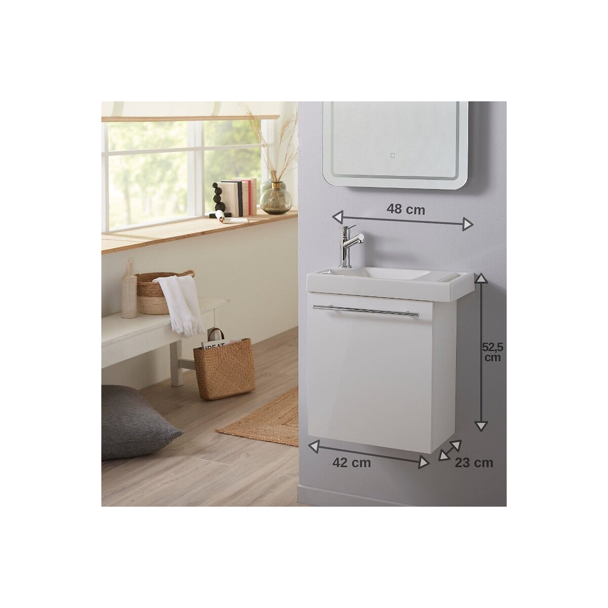 Cet ensemble lave-mains est composé d'un meuble lave mains blanc, d'un lave-mains blanc en céramique équipé d'un porte serviette, d'une robinetterie eau froide, d'une bonde et d 'un siphon. Cet ensemble prêt à poser contient : Meuble Meuble en mdf laqué blanc Ce meuble est équipé d'un niveau de tablette permettant de ranger vos produits d'entretien et votre papier toilette. La porte est réversible. Elle est munie d'une poignée à placer à l 'horizontale. Lave-mains Le lave-mains est en céramique blanc. Il est équipé d'un porte serviette et d 'une plage de dépose. Le lave-mains est non réversible. Robinetterie La robinetterie est placé à gauche et est non réversible. C'est une robinetterie eau froide uniquement.flexible non fourni Le meuble est livré monté. Conseils : Ne fixez la poignée que lorsque vous aurez choisi le sens d'ouverture de la porte.