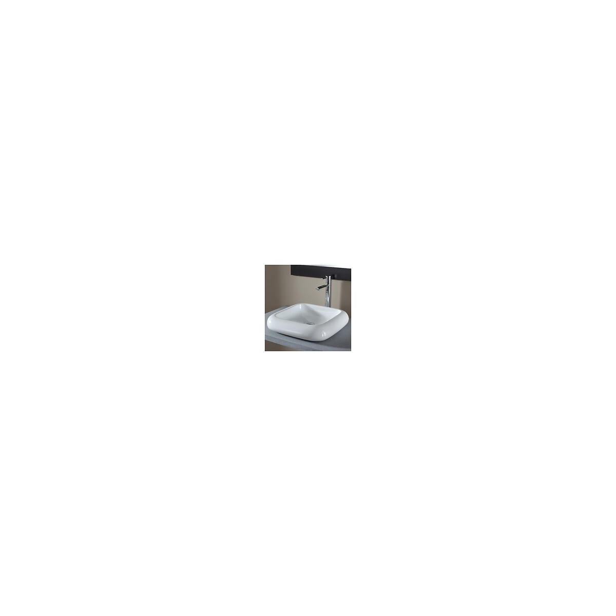 Vasque à poser carrée en céramique blanche Épaisseur des rebords +/-6cm Côtés du carré intérieur : 35cm Sans trop plein Sans plage de robinetterie Bonde à écoulement libre Livré sans bonde
