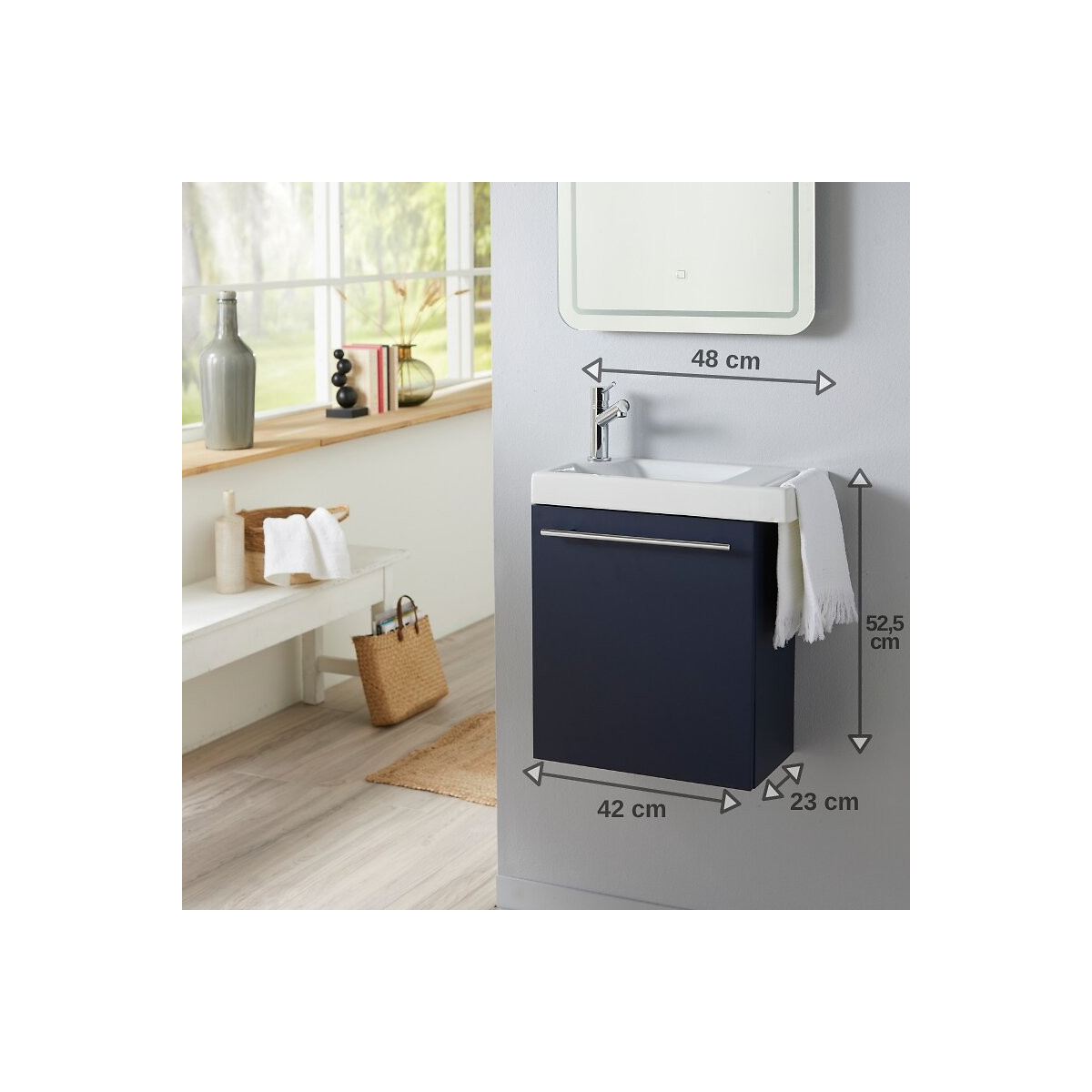 Cet ensemble meuble lave-mains suspendu Hamac couleur Bleu nuit contient : Un meuble couleur Bleu nuit + un lave-mains en céramique porte-serviette + une robinetterie eau froide + une bonde + un siphon + un kit de fixation murale CARACTÉRISTIQUES TECHNIQUES : MEUBLE : Meuble en mélaminé finition mate 'Bleu'. Ce meuble est équipé d'un niveau de tablette. La porte réversible est équipée d'une poignée faisant office de porte serviette. Épaisseur du caisson et de la porte 16mm. Meuble monté en usine. Dimensions du meuble : L42.5xH47xP23.5 cm. Conseil : Ne fixer la poignée que lorsque vous aurez choisi le sens d'ouverture de la porte. LAVE-MAINS : Lave-mains en céramique blanc. Ce lave mains est équipé d'un porte serviette et d'une plage de dépose. Lave-mains non réversible. ROBINETTERIE : Robinet eau froide. Flexibles non inclus. Robinet placé à GAUCHE non réversible. VIDAGE : La bonde à écoulement libre et le siphon sont inclus. PRÉCAUTIONS D'INSTALLATION : La poignée est à monter soi même. Les trous de pré perçage à l'arrière de la porte sont prévus pour l 'installation de la poignée uniquement à l 'horizontale. Ne fixer la poignée que lorsque vous aurez choisi le sens d'ouverture de la porte Les meubles doivent être fixés au mur. Utilisez les matériaux de fixation en fonction de vos murs (chevilles et visseries).